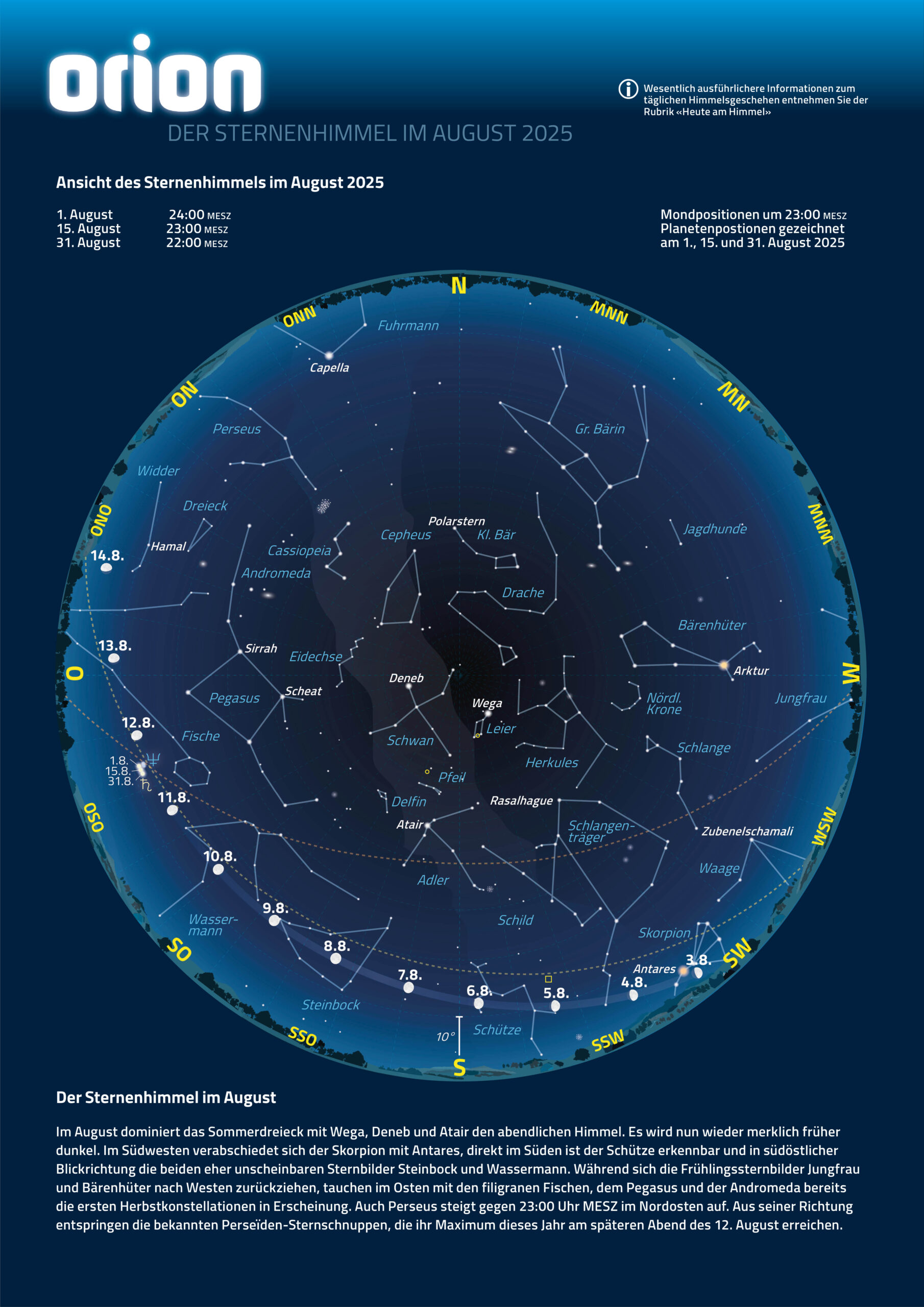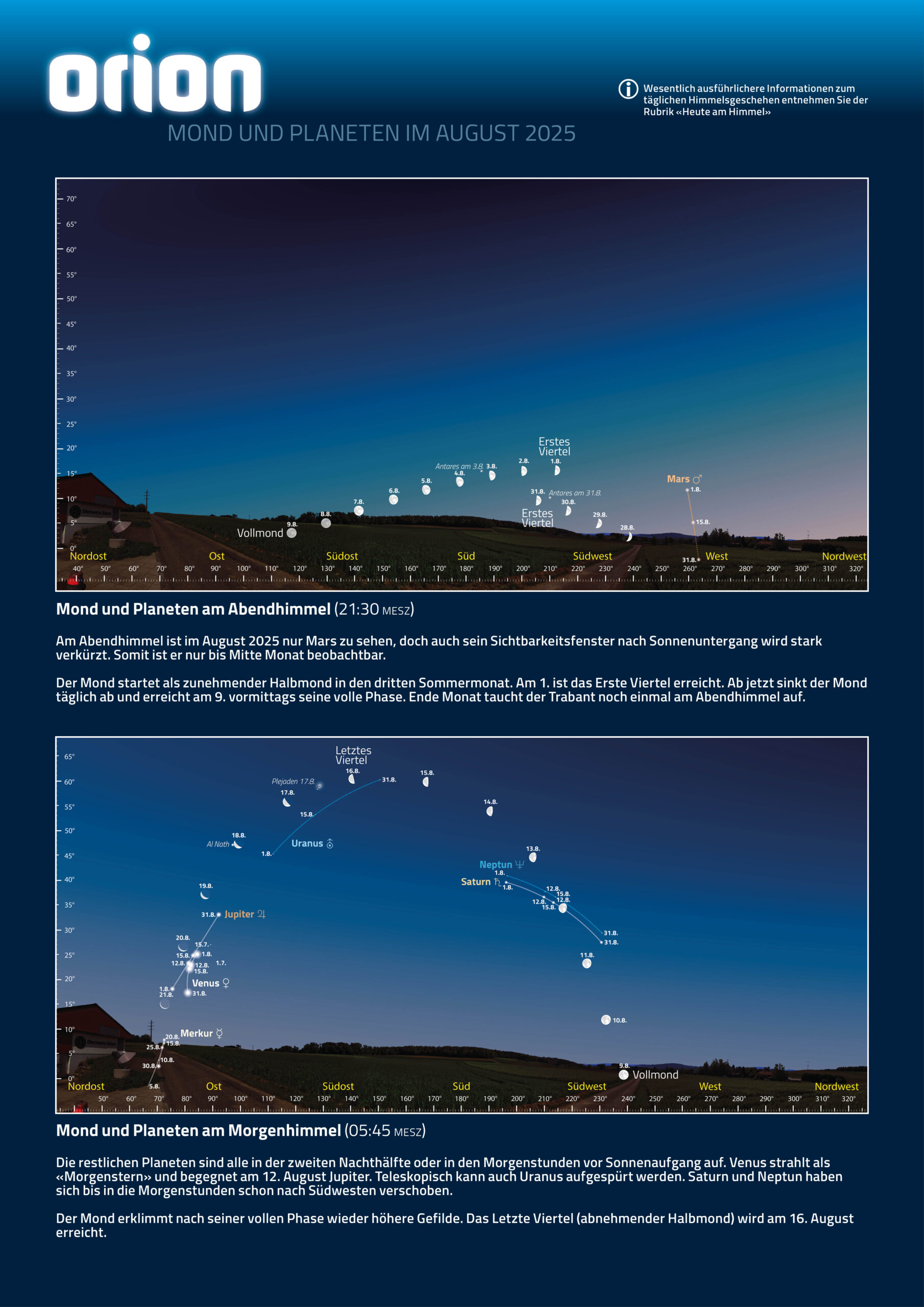| Mond | Der Mond startet als zunehmender Halbmond (am 1. August) in den dritten Sommermonat. Es ist dies der kleinste zunehmende Halbmond des Jahres. Der Trabant «schleicht» an den folgenden Abenden weit südlich der Ekliptik durch die Waage, den Skorpion und weiter via Schlangenträger in den Schützen und den Steinbock, wo wir am Vormittag des 9. Vollmond haben. Nach dem Vollmondtermin verspäten sich die Mondaufgänge immer weiter in die zweite Nachthälfte hinein und später in die Morgenstunden. Jetzt steigt der Mond langsam wieder auf, im Volksmund ist er jetzt «obsigend». Langsam abnehmend begegnet er am 12. August dem Ringplaneten Saturn. Das Letzte Viertel (abnehmender Halbmond) wird am 16. erreicht. Abermals steuert die immer dünner werdende Mondsichel auf die Plejaden zu und macht am Morgen des 19. 11¼° nordwestlich von Jupiter Halt. Am darauffolgenden Morgen steht sie 6¾° nordwestlich von Venus. In den letzten Augusttagen taucht der Mond noch einmal am Abendhimmel auf, wo er am 31. zum zweiten Mal im selben Monat sein Erstes Viertel erreicht. |