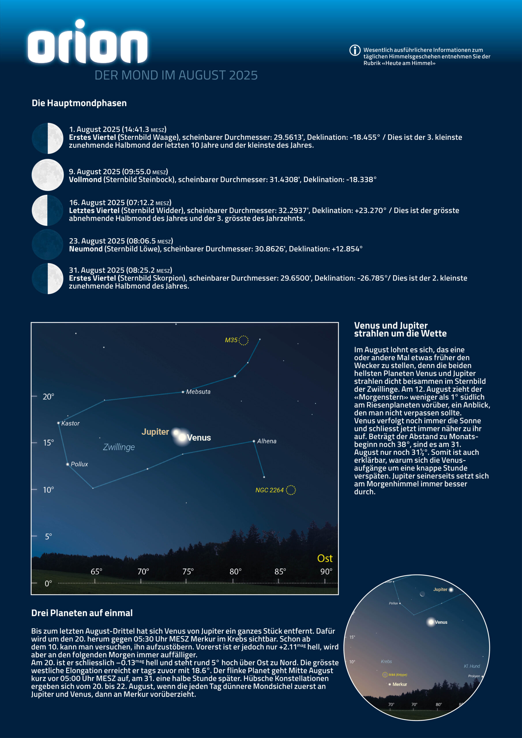 | Venus | Venus setzt ihrer Rolle als «Morgenstern» noch die Krone auf, indem sie Jupiter umgarnt. Am 12. August zieht sie in nur ⅞° südlichem Abstand an ihm vorüber. Das auffällige Planetenpaar sollte man nicht verpassen. Venus eilt der Sonne hinterher und verkürzt dabei ihren westlichen Abstand merklich von 38° am 1. auf 31½° am 31., was sich auch auf ihre Aufgänge auswirkt, die sich um eine knappe Stunde verspäten. Die scheinbare Helligkeit von Venus liegt Ende Monat knapp unter –4.00mag. |
