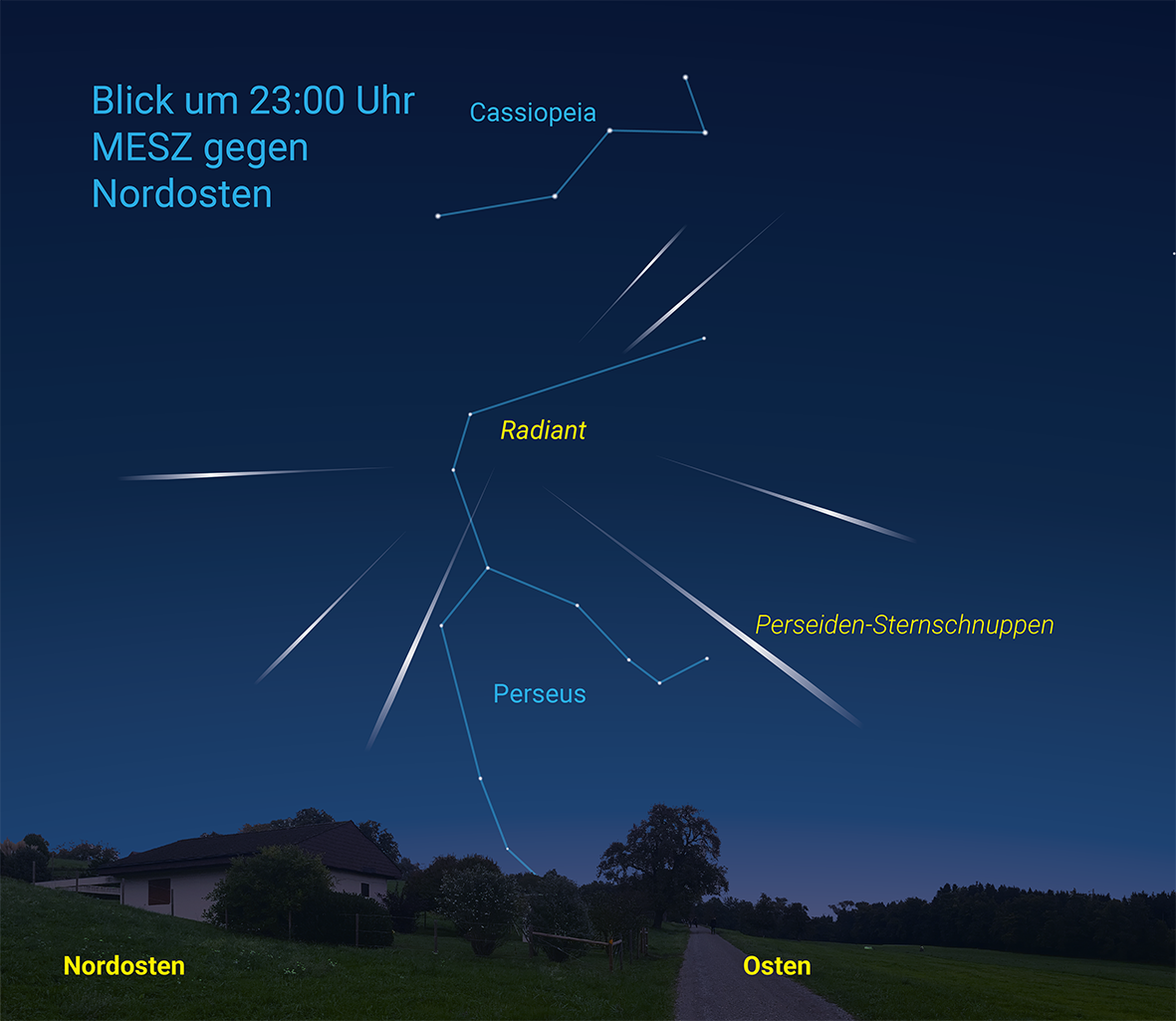 Wie der Name «Perseiden» verrät, scheinen die Meteore alle aus der Richtung des Sternbilds Perseus zu entspringen, welches nach 23:00 Uhr MESZ im Nordosten unterhalb der Cassiopeia aufgeht.