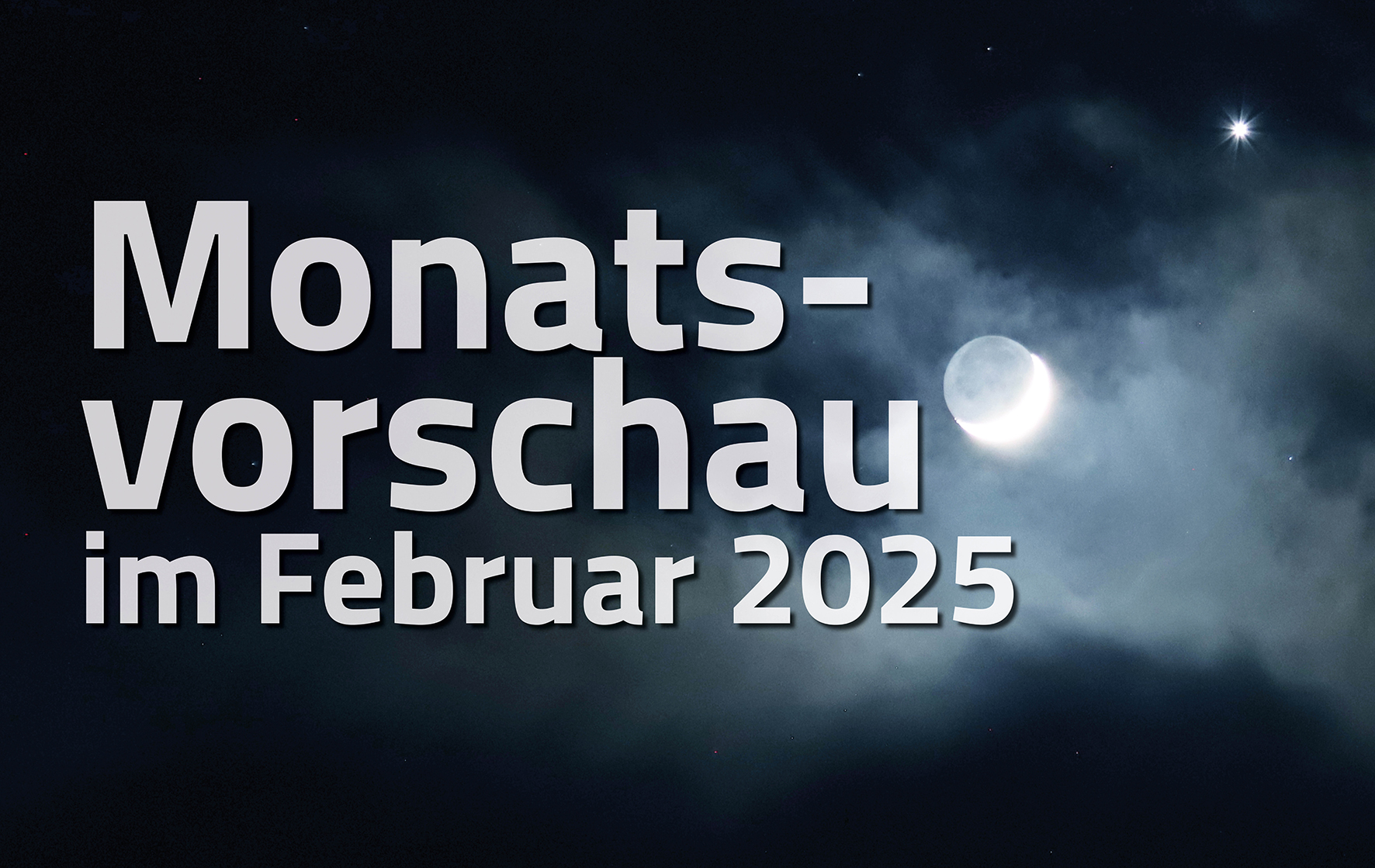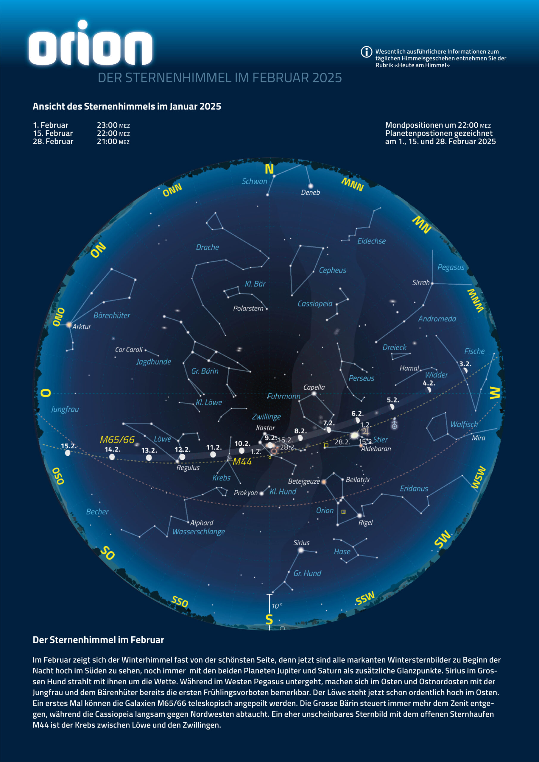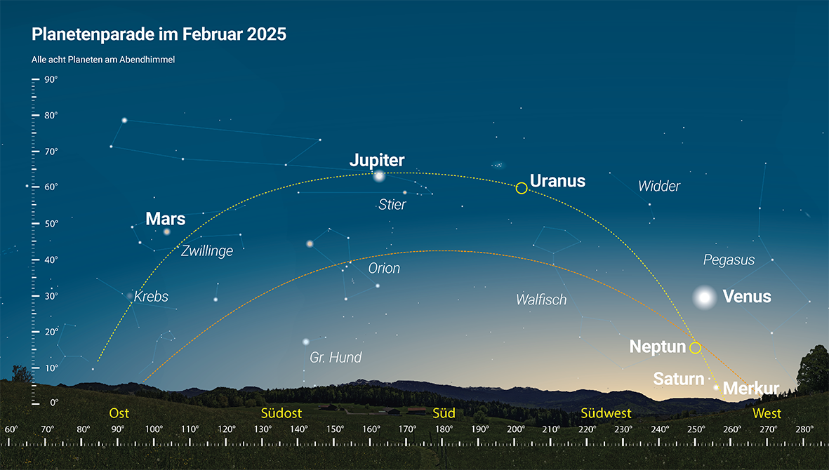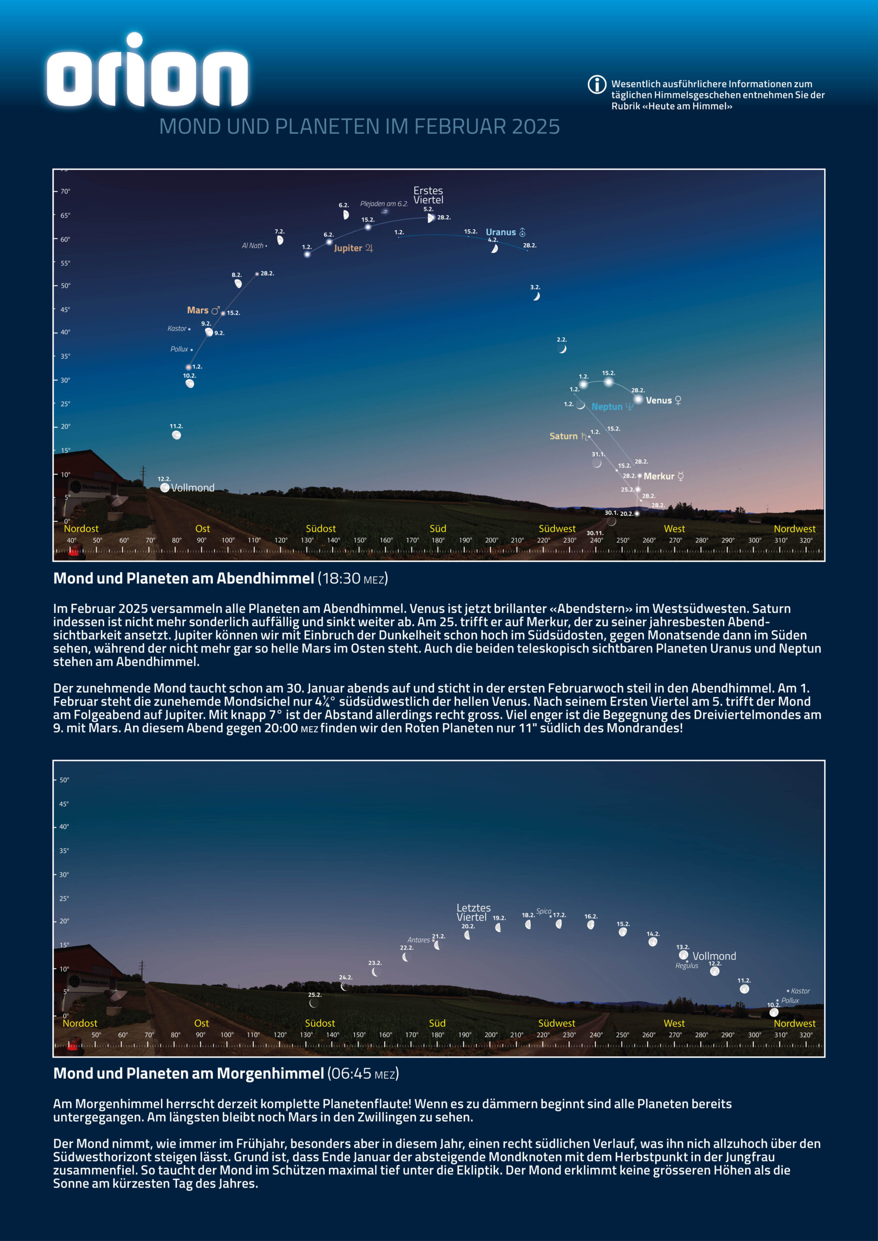 Merkur nimmt im Februar zu seiner besten Abendsichtbarkeit Anlauf und stösst dabei am 24. und 25. auf den langsam schwierig zu beobachtenden Saturn. Über den beiden strahlt die helle Venus als «Abendstern», hoch in südlicher Richtung steht Jupiter im Stier, östlich von ihm Mars in den Zwillingen. Auch Uranus und Neptun sind derzeit am Abendhimmel auffindbar, allerdings nur teleskopisch. Von Auge können wir ab Mitte Februar Merkur, Venus, Jupiter und Mars sehen. Für Saturn empfiehlt sich indessen ein Fernglas.