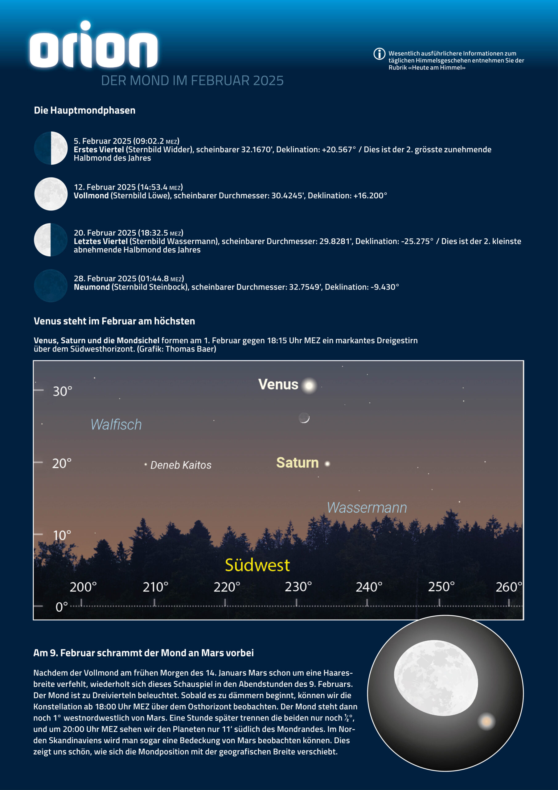 MondAm 29. Januar hatten wir Neumond. Schon in den ersten Februar taucht die zunehmende Mondsichel am Abendhimmel auf und begegnet am 6. der hellen Venus. Das Erste Viertel (zunehmender Halbmond) ist am 5. erreicht. Am Abend des 9. begegnet der zunehmende Dreiviertelmond dem Roten Planeten Mars. Vollmond haben wir am 12. Ab jetzt nimmt der Trabant wieder ab und verlagert seine Sichtbarkeit in die zweite Nachthälfte, in der letzten Februarwoche dann an den Morgenhimmel. Das Letzte Viertel (abnehmender Halbmond) ist am 20. erreicht. Am 28. haben wir Neumond.