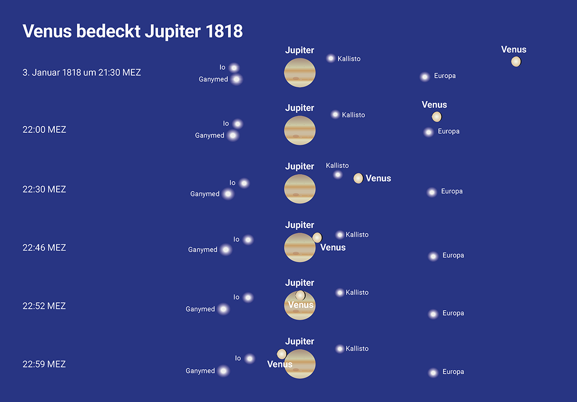 Noch viel seltener geschieht es, dass sich Planeten gegenseitig bedecken! Auf Wikipedia wird fälschlicherweise geschrieben, dass lediglich Venus Merkur bedecken kann, was nicht stimmt. Der flinke Merkur kann auch Saturn (9. Dezember 1808, Antarktis), Neptun (15. Juli 2067) oder Jupiter bedecken (kein zeitnahes Ereignis). Venus bedeckte letztmals 1818 den Riesenplaneten Jupiter in den späten Nachtstunden des 3. Januars, leider von Europa aus unter dem Horizont und nur 16½° westlich der Sonne. Wie wir in der Abbildung unten sehen, dauerte die Planetenbedeckung nur 13 Minuten