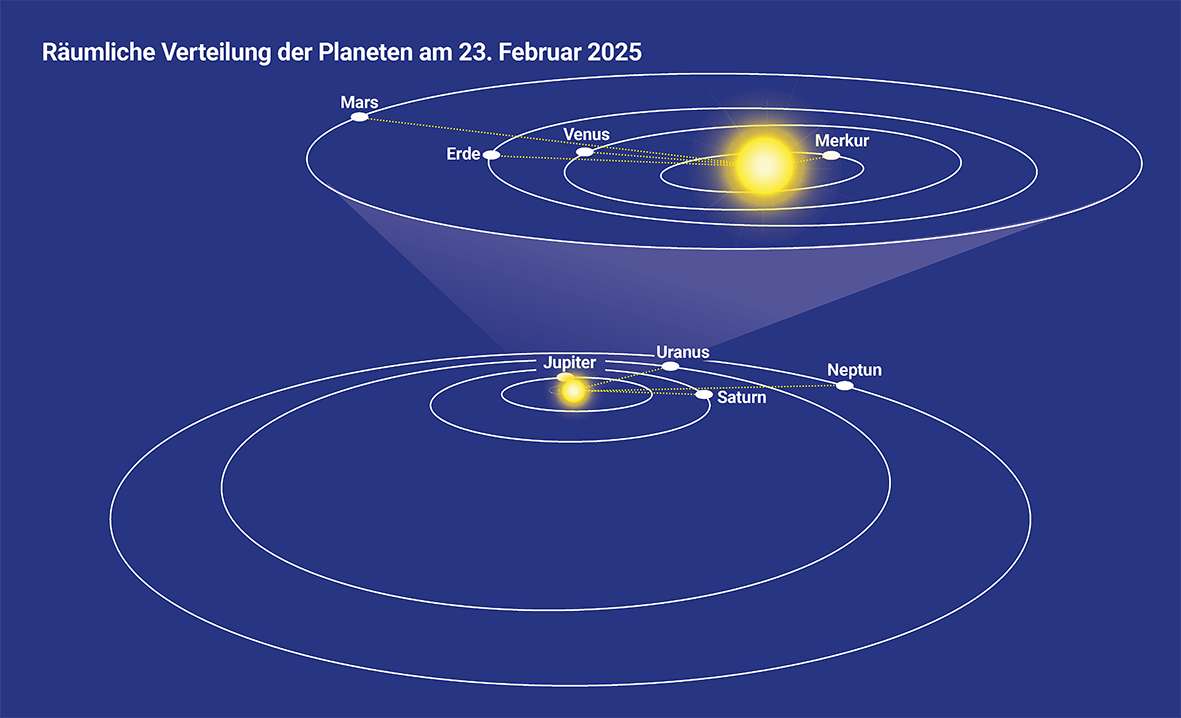 Im Februar 2025 versammeln sich alle Planeten östlich der Sonne, hier am Abend des 23. um 18:30 Uhr MEZ dargestellt. (Grafik: Thomas Baer)