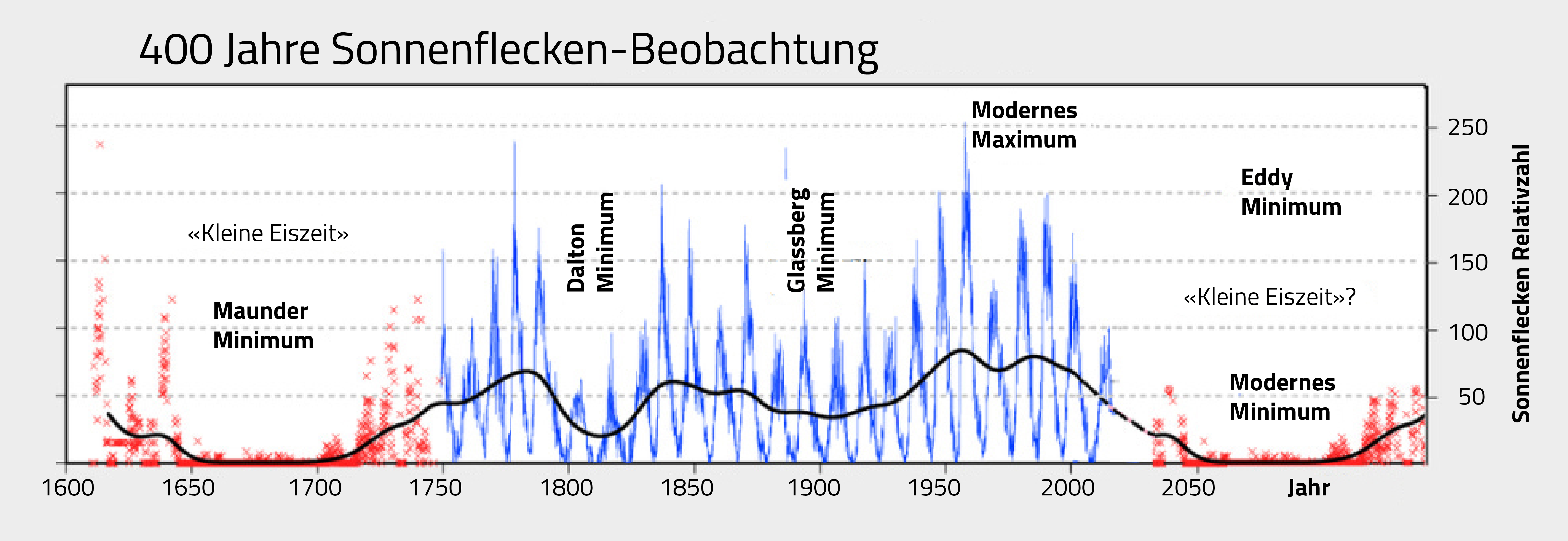 Was uns die nächsten Jahrzehnte erwarten wird, ist spekulativ. Jedoch gibt es Forschungsarbeiten, denen zufolge die Sonne zwischen 2020 und bis ca. 2055 in eine inaktive Phase übergehen könnte. Jedenfalls sind der 24. und auch der 25. Zyklus deutlich niedriger als die Zyklen davor. Ob allerdings ein analoges Phänomen wie das Maunder-Minimum eintritt, können wir vorderhand nicht vorhersagen. Dies wird sich zeigen.