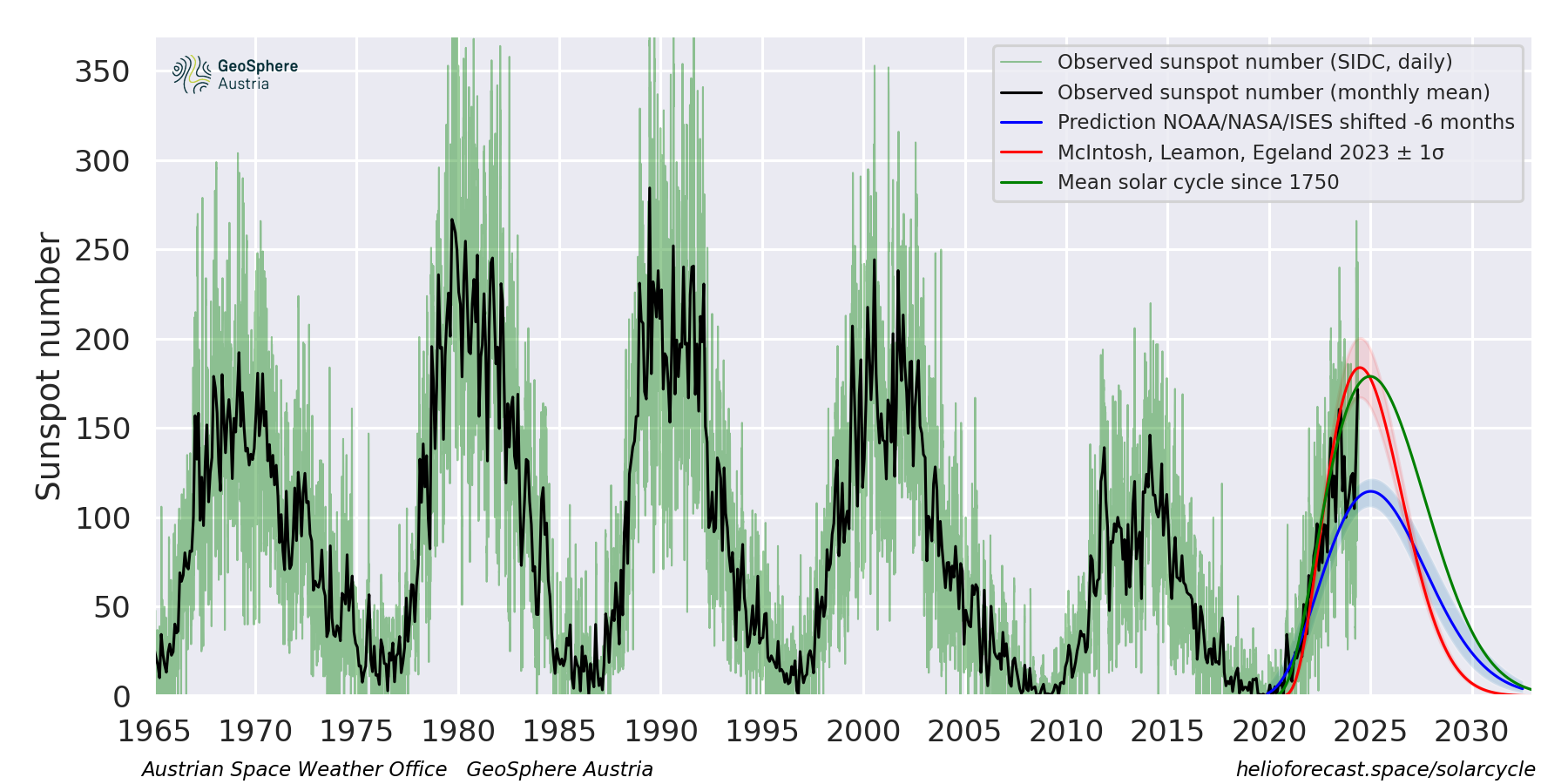 Aktuell liegt der 25. Aktivitätszyklus über dem Vorgängerzyklus und auch deutlich über der ursprünglichen Prognose (blaue Kurve). (Quelle: GeoSphere Austria)