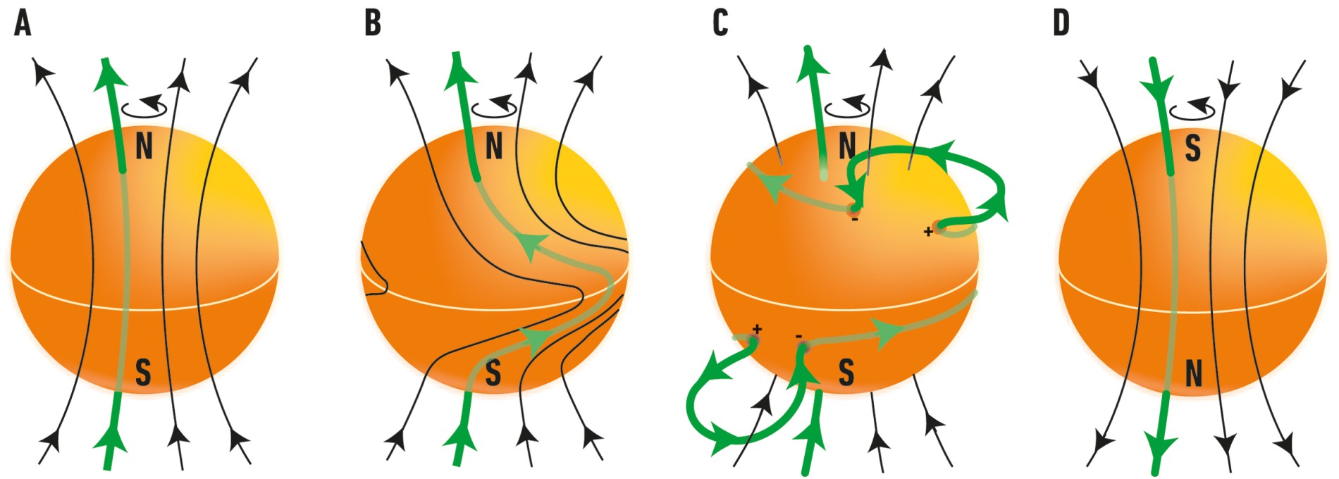 Nach einem solaren Maximum, wenn die Umpolung erfolgt ist, stabilisiert sich das Magnetfeld; die Sonne tritt in eine ruhigere Phase ein (solares Minimum), ehe der beschriebene Vorgang von Neuem beginnt.