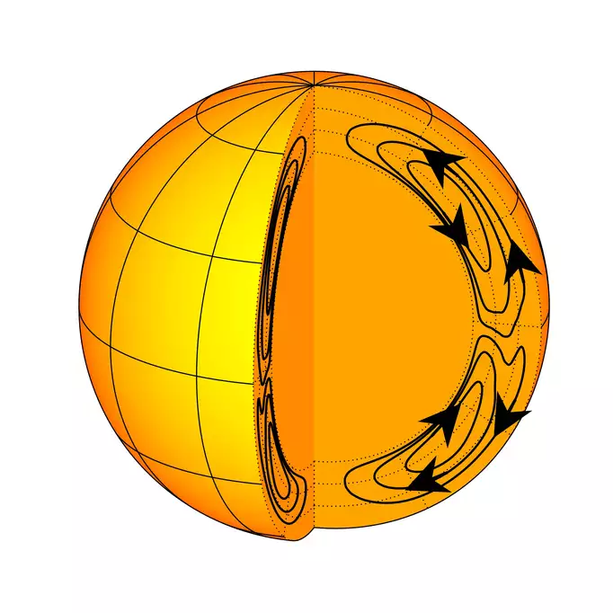 Gewaltige Ströme: Im Innern der Sonne bewegt sich Plasma oberflächennah in Richtung der Pole und an der Basis der Konvektionszone in Richtung Äquator (oben). Unten sehen wir schematisch, wie die magnetische Umpolung der Sonne erfolgt. (Quelle: Max-Planck Institut)