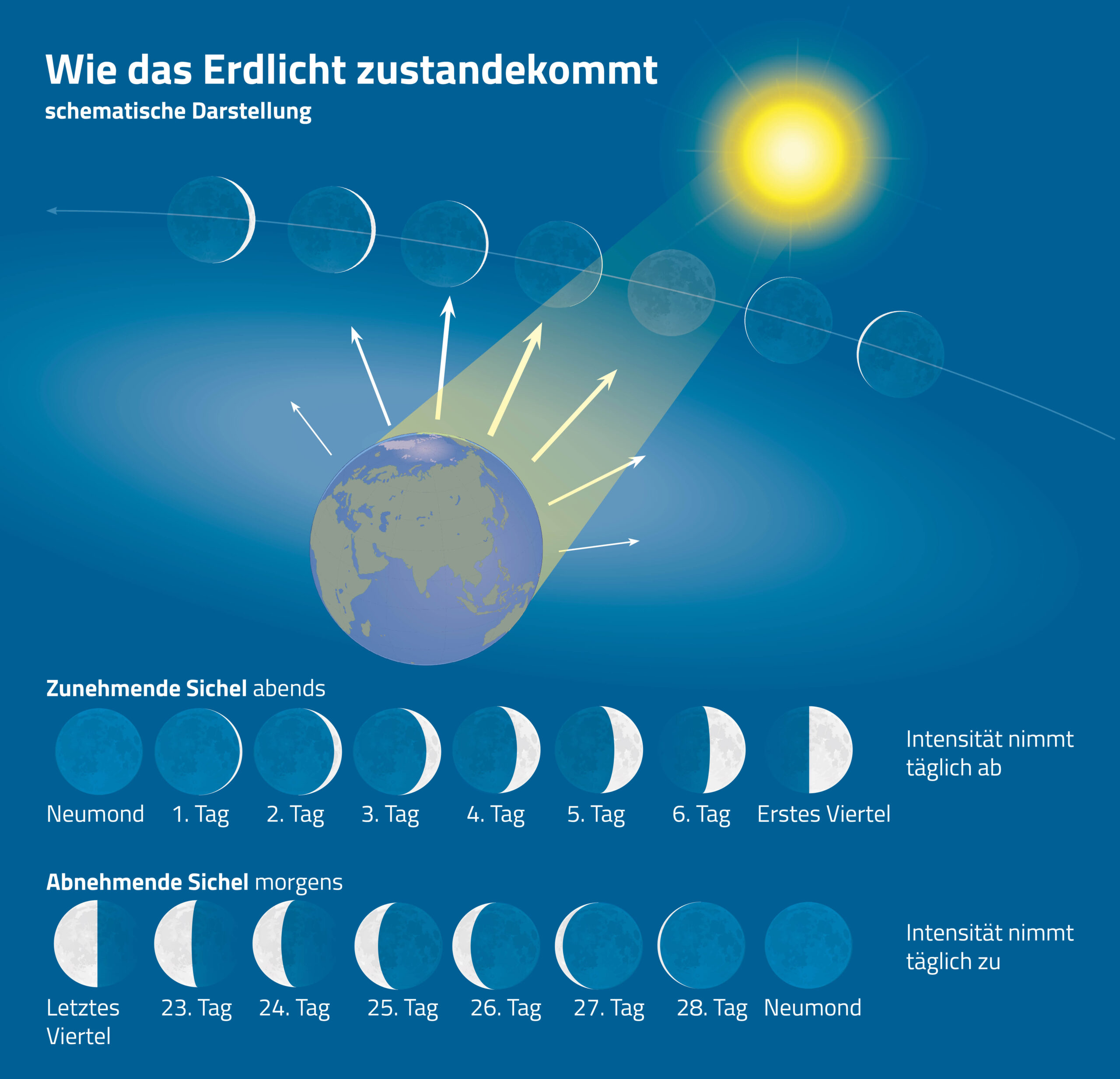 Tage vor und nach Neumond können wir das Erdlicht auf dem Mond sehen. Es handelt sich hierbei um von der Erde reflektiertes Sonnenlicht, das die Mondnacht erhellt. (Grafik: Thomas Baer)