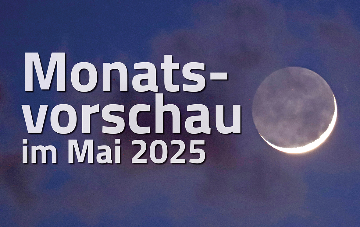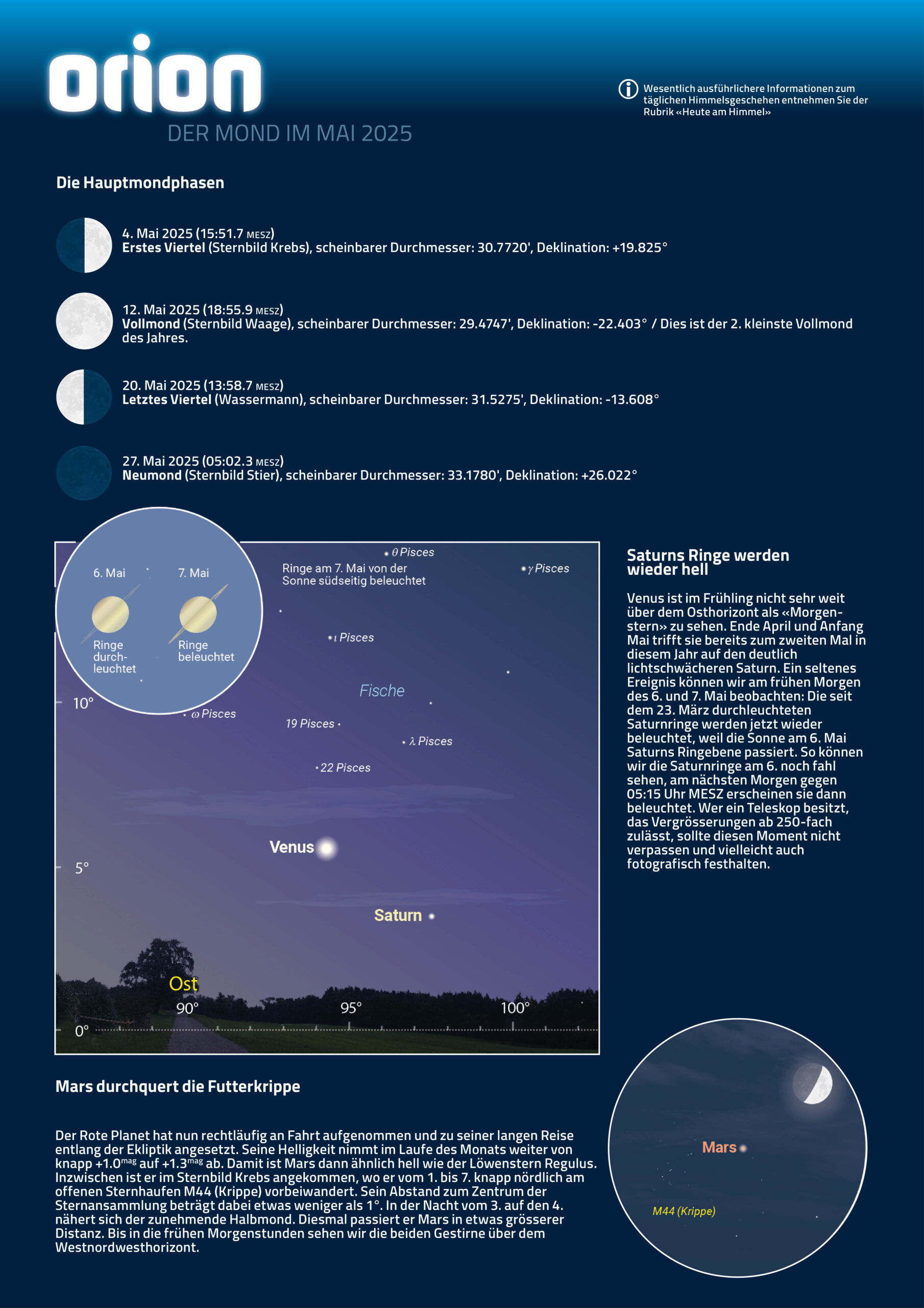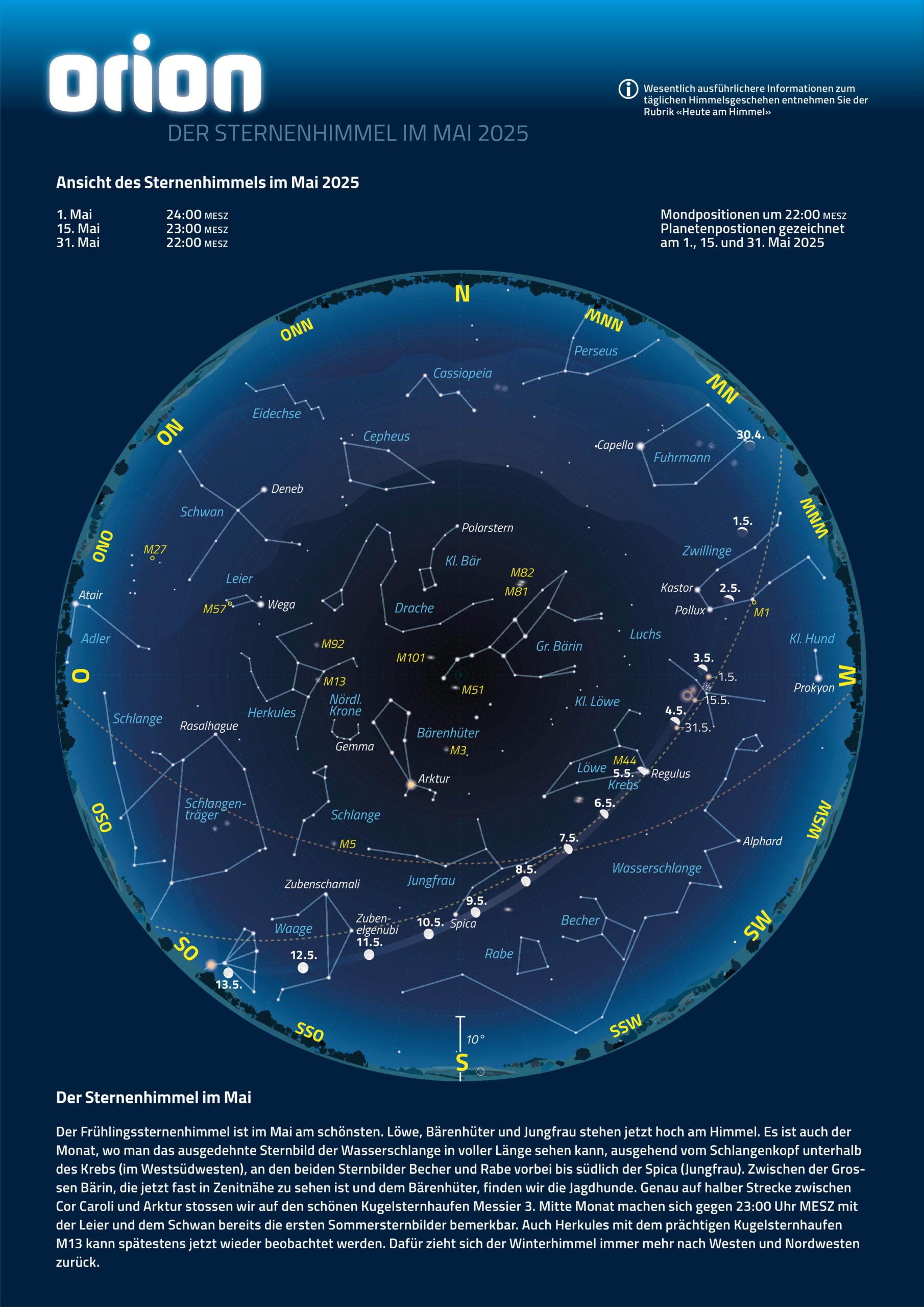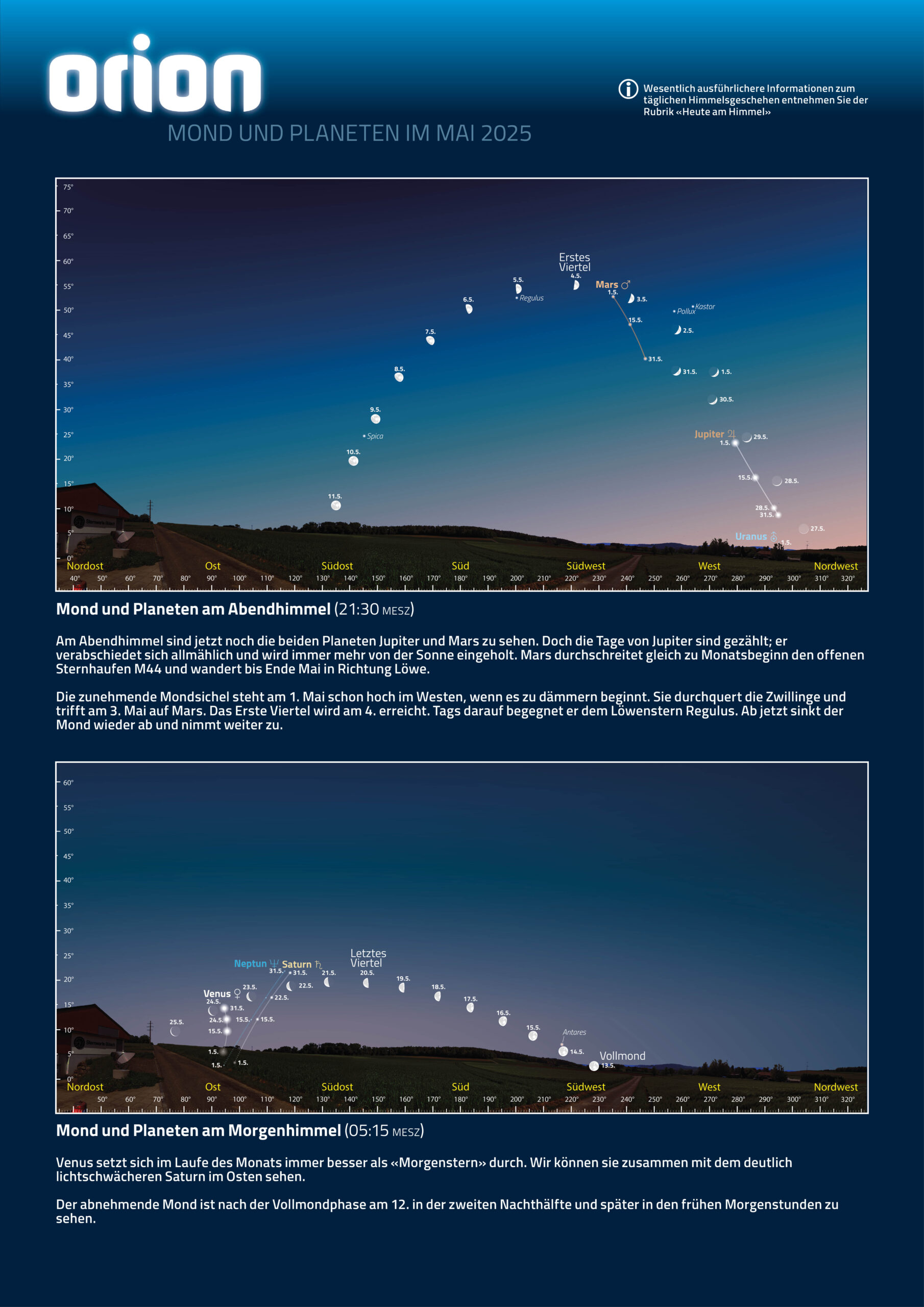 MondWie schon im Vormonat startet der Mond als Sichel in den Wonnemonat. Er gewinnt Abend für Abend rasch an Höhe und durchschreitet die Zwillinge und den Krebs. Das Erste Viertel (zunehmender Halbmond) haben wir am 4. Mai. Tags darauf trifft der Trabant auf den Löwenstern Regulus, an dem er in nur 1¼° nördlichem Abstand vorüberzieht (knapp 3 Mondbreiten). Das Sternbild Löwe steht jetzt abends hoch in südsüdwestlicher Blickrichtung. Je voller der Mond zur Monatsmitte hin wird – Vollmond haben wir am 12. Mai – desto mehr sinkt er via Jungfrau und Waage in Richtung Südosten ab. In der verbleibenden Monatshälfte wechselt er in die zweite Nachhälfte und nimmt ab. Das Letzte Viertel (abnehmender Halbmond) ist am 20. erreicht, Neumond am 27. Bis zum Monatsende taucht dann wieder die schmale Mondsichel am Abendhimmel auf.