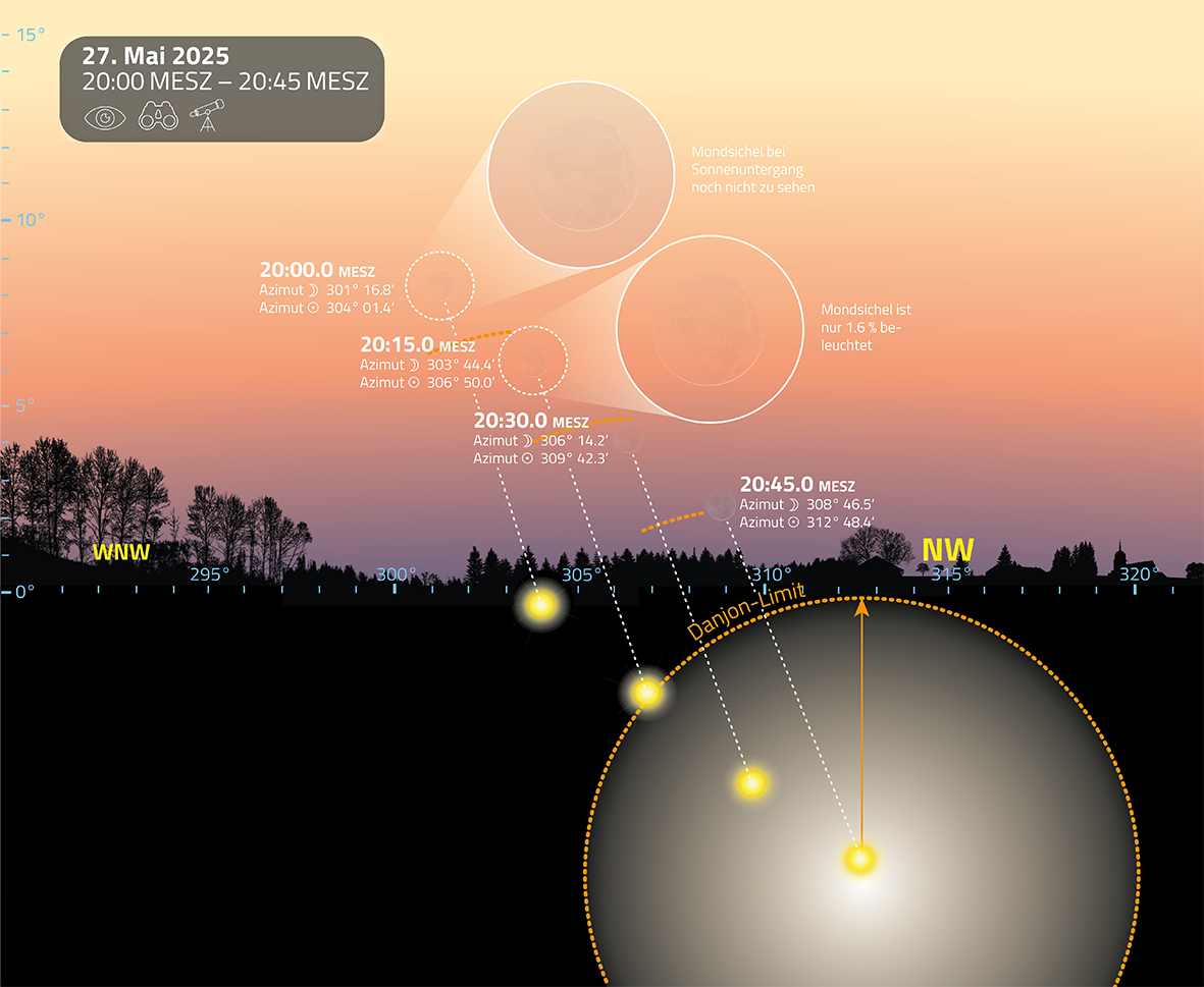 Am 27. Mai 2025 kann man eine Mondsichel nur 16.7 Stunden nach Neumond erleben! (Grafik: Thomas Baer)