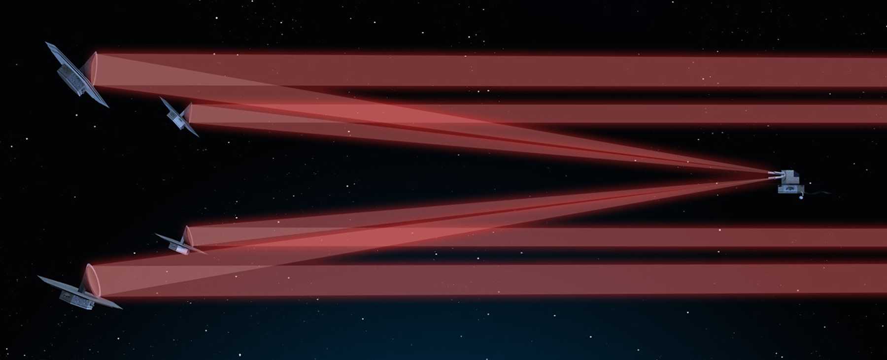 Fünf Satelliten der LIFE-​Mission sind so miteinander verbunden, dass sie zusammen ein grosses Weltraumteleskop bilden. (Grafik: ETH Zürich / LIFE Initiative)