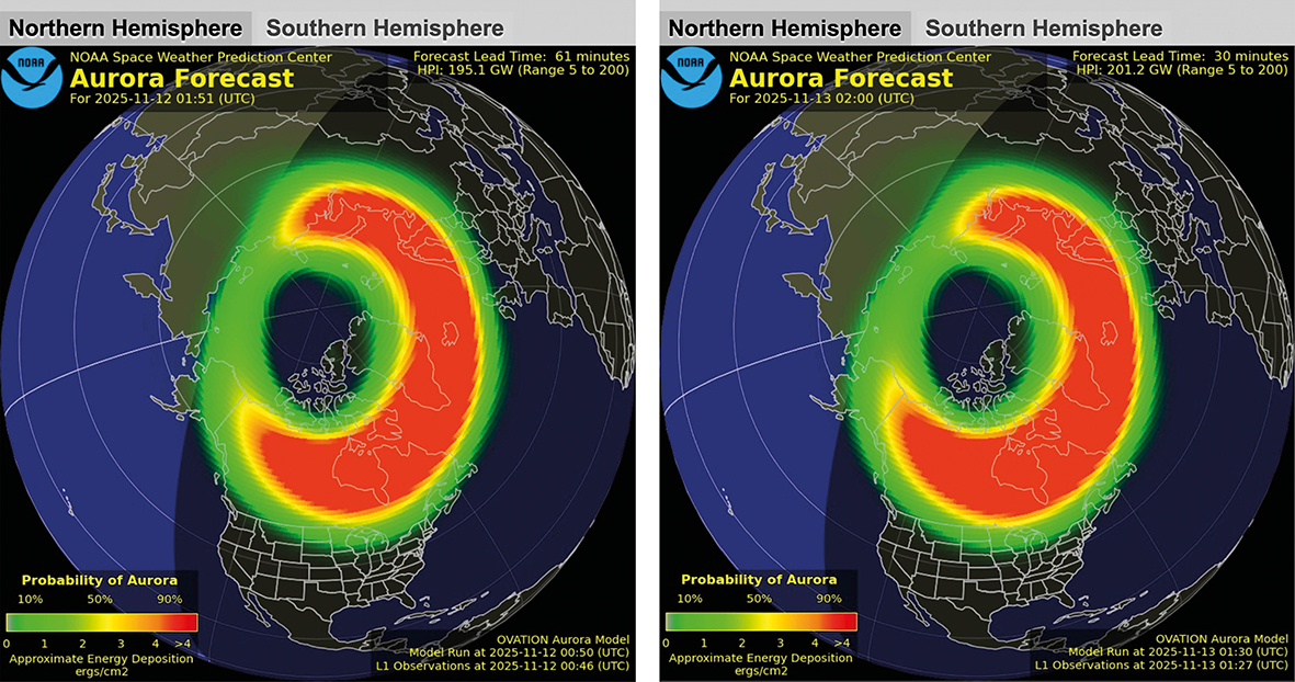 Die beiden Polarlichtovale am Morgen des 12. (links) und am Morgen des 13. Novembers 2025 (rechts) sahen fast identisch aus. Dies ist aber noch längst kein Garant für Polarlichter bis in mittlere geografische Breiten. (Quelle: Spaceweather)