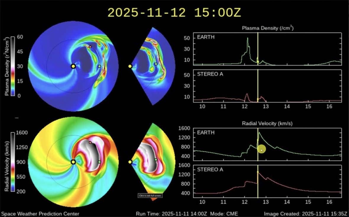 Am Abend des 12. Novembers 2025 hätte es nochmals spannend werden können. Die Erde lag noch immer im Einflussbereich von Plasmawolken. Im oberen Diagramm wird zwar ein kleinerer Peak in der Plasmadichte angezeigt, doch durch die enorme Sonnenwindgeschwindigkeit (im unteren Diagramm grau bis schwarz) und dem bereits geschwächten Erdmagnetfeld hätten die geladenen Teilchen tiefer eindringen können. (Quelle: Spaceweather)