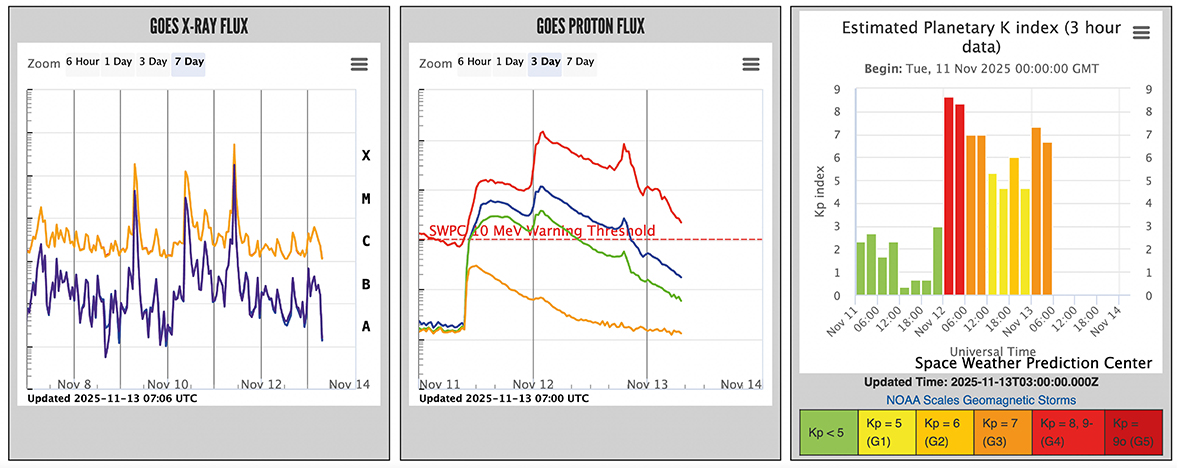 Doch es gilt bei diesen Phänomenen immer verschiedene Dinge im Auge zu behalten. Da sind einmal die Daten des GOES-Satelliten (Geostationary Operational Environmental Satellite), der die von der Sonne ausgehende Röntgenstrahlung misst. Aufgrund dieser Daten können wir überhaupt erst erkennen, ob, und in welcher Stärke etwas von der Sonne abgefeuert wurde. Er liefert uns also Informationen über Sonneneruptionen, Plasmatemperaturen und Teilchenemissionen; erst so wird es möglich, den Fluss hochenergetischer Teilchen zu bestimmen, was für die Vorhersage von Weltraumstürmen entscheidend ist. So erkennen wir in den Diagrammen unten die drei Peaks der einzelnen Ereignisse sowie (Mitte) der steigende Protonenfluss, zwischen dem 10. und 14. November 2025.