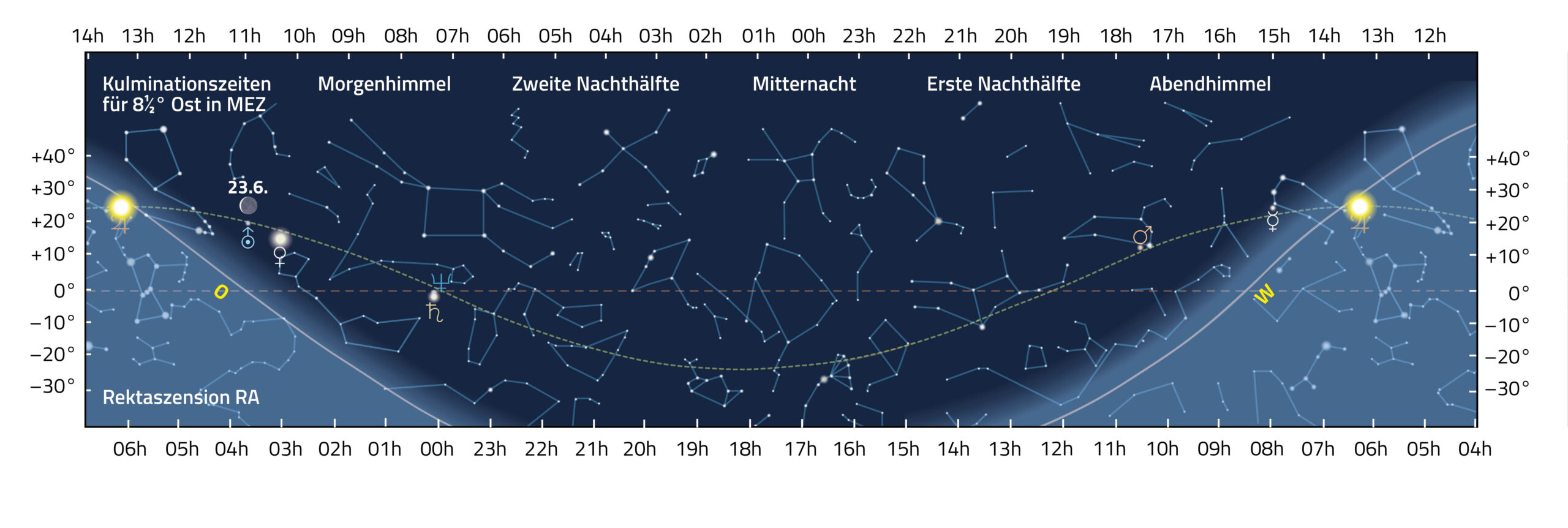 Hier sehen wir die Planeten längs der Ekliptik. Venus ist als «Morgenstern» erreicht zu Monatsbeginn ihre grösste westliche Elongation. Auch Saturn ist am Morgenhimmel zu sehen. Jupiter verabschiedet sich vom Abendhimmel, während Mars im Löwen unterwegs ist. Merkur bietet im Juni 2025 seine zweitbeste Abendsichtbarkeit in diesem Jahr. (Grafik: Thomas Baer, Redaktion ORION)