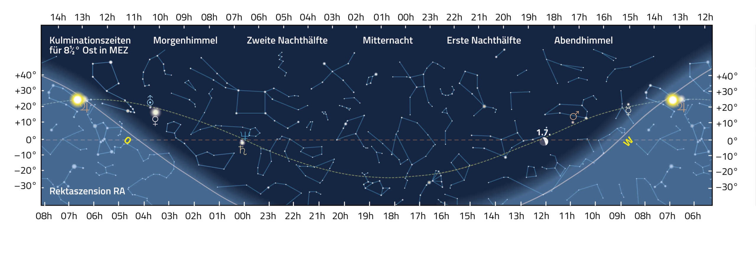 Heute Abend um 22:00 Uhr MESZ können wir den fast zunehmenden Halbmond in der Jungfrau sehen. Venus ist jetzt als «Morgenstern» zu sichtbar. Uranus taucht zögerlich am Morgenhimmel auf, bleibt aber wegen der früh einsetzenden Dämmerung noch unbeobachtbar. Saturn finden wir westlich von ihr nahe des Frühlingspunktes nahe von Neptun. Merkur ist abends ab 22:00 Uhr MESZ in der Dämmerung zu sehen und Mars entfernt sich vom Löwenstern Regulus.