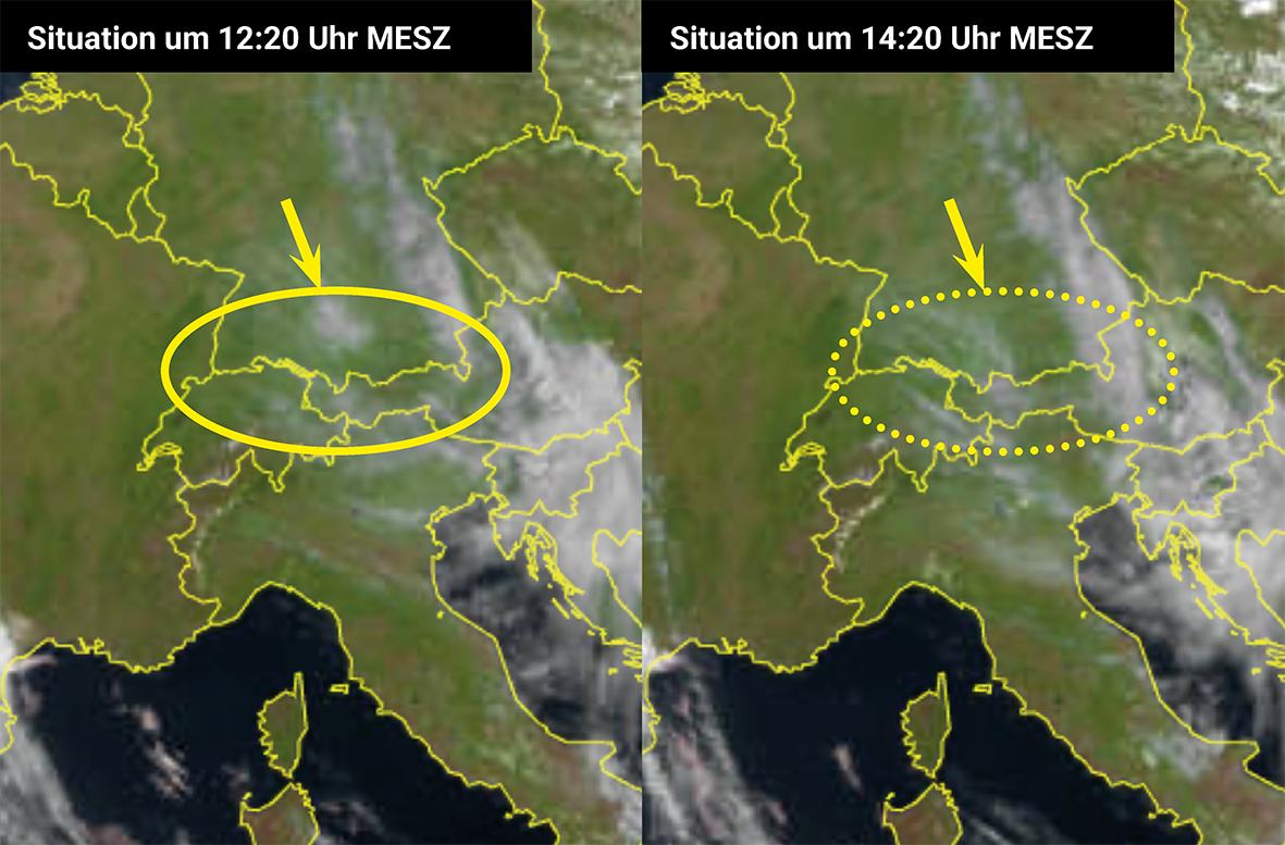 Hohe Schleierwolken mit Auflösungstendenzen im Verlaufe des Nachmittags. Am Vormittag und Mittag ziehen noch ein paar dichtere hohe Wolkenfelder knapp östlich der Schweiz vorbei und streifen dabei unser Land. Oben sehen wir die Situationen um 12:20 Uhr MESZ und 14:20 Uhr MESZ. Der gelbe Pfeil zeigt die Zugrichtung der Wolken. Die schwache Front über Österreich zieht weiter in Richtung Südosten. Dahinter lockern auch die Schleierwolken allmählich auf.