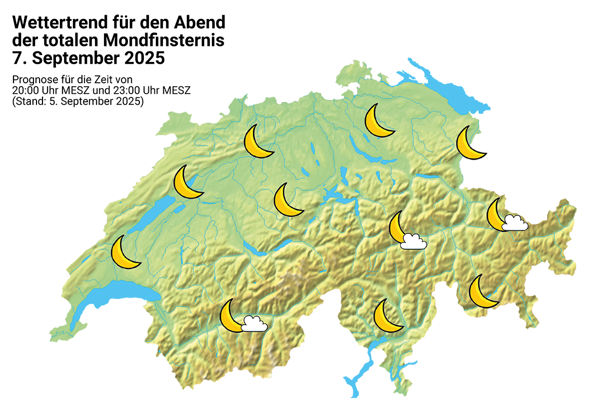 Wetter für die totale Mondfinsternis: Heute Sonntag liegen morgendliche Nebelfelder vor allem im Mittelland. Diese lösen sich rasch auf und dann ist es überwiegend sonnig. Die dünnen Schleierwolken, welche tagsüber noch vorbeiziehen dürften sich bis zum Abend hin verzogen haben. Somit steht einer meist wolkenfreien Mondfinsternis nichts im Wege.