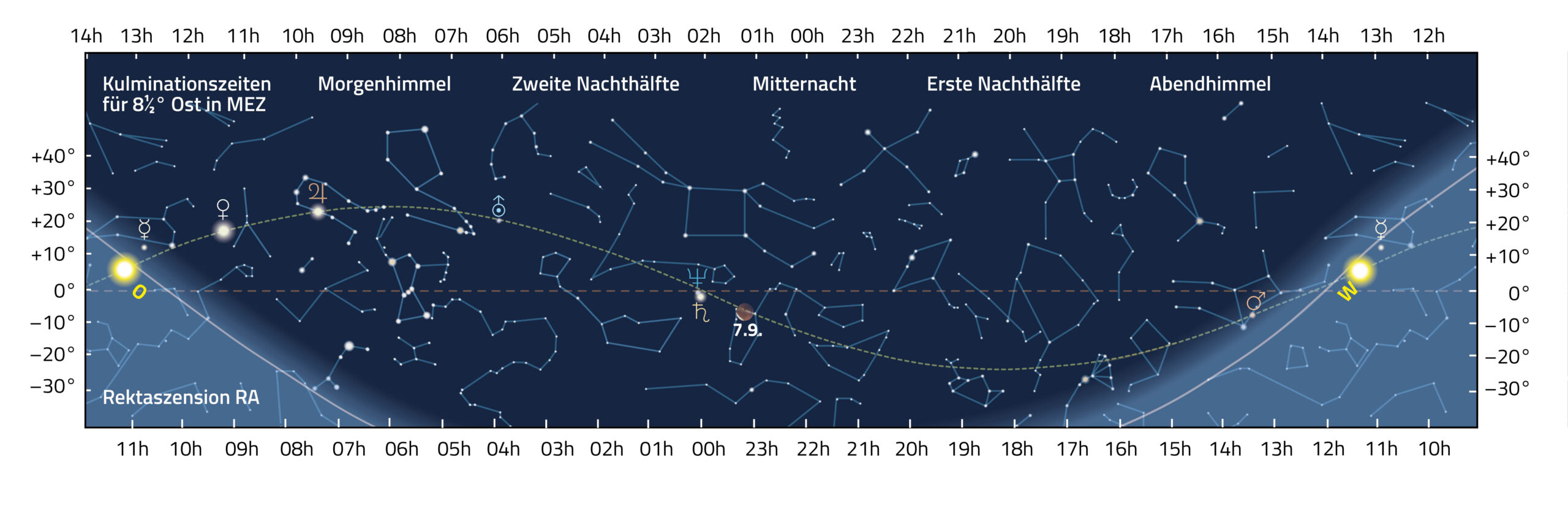 Heute Abend gegen 21:00 Uhr MESZ können wir den soeben wieder aus dem Kernschatten austretenden Vollmond im Wassermann sehen. Die totale Mondfinsternis ist ab Mondaufgang zu beobachten. Dem Kalenderteil entnehmen Sie den genauen Finsterniszeitplan. Mars entfernt sich vom Stern Theta Virginis. Der Planet ist nur noch kurz und unter schwierigen Bedingungen zu sehen. Venus ist jetzt als «Morgenstern» zu sichtbar und läuft nun Jupiter weiter davon. Merkur kann in den ersten Septembertragen noch am Morgenhimmel gesehen werden, sinkt aber rasch ab. Uranus ist bis zum Dämmerungsbeginn teleskopisch am Morgenhimmel sichtbar. Saturn finden wir westlich von ihr nahe des Frühlingspunktes nahe von Neptun.