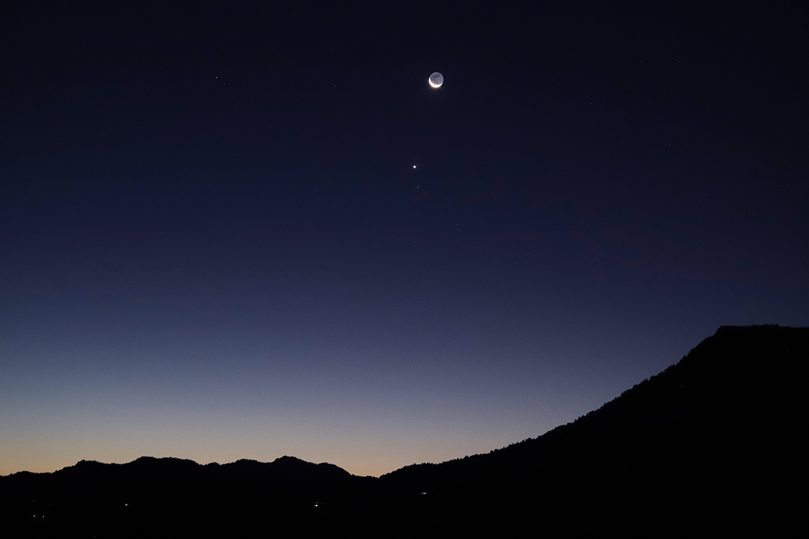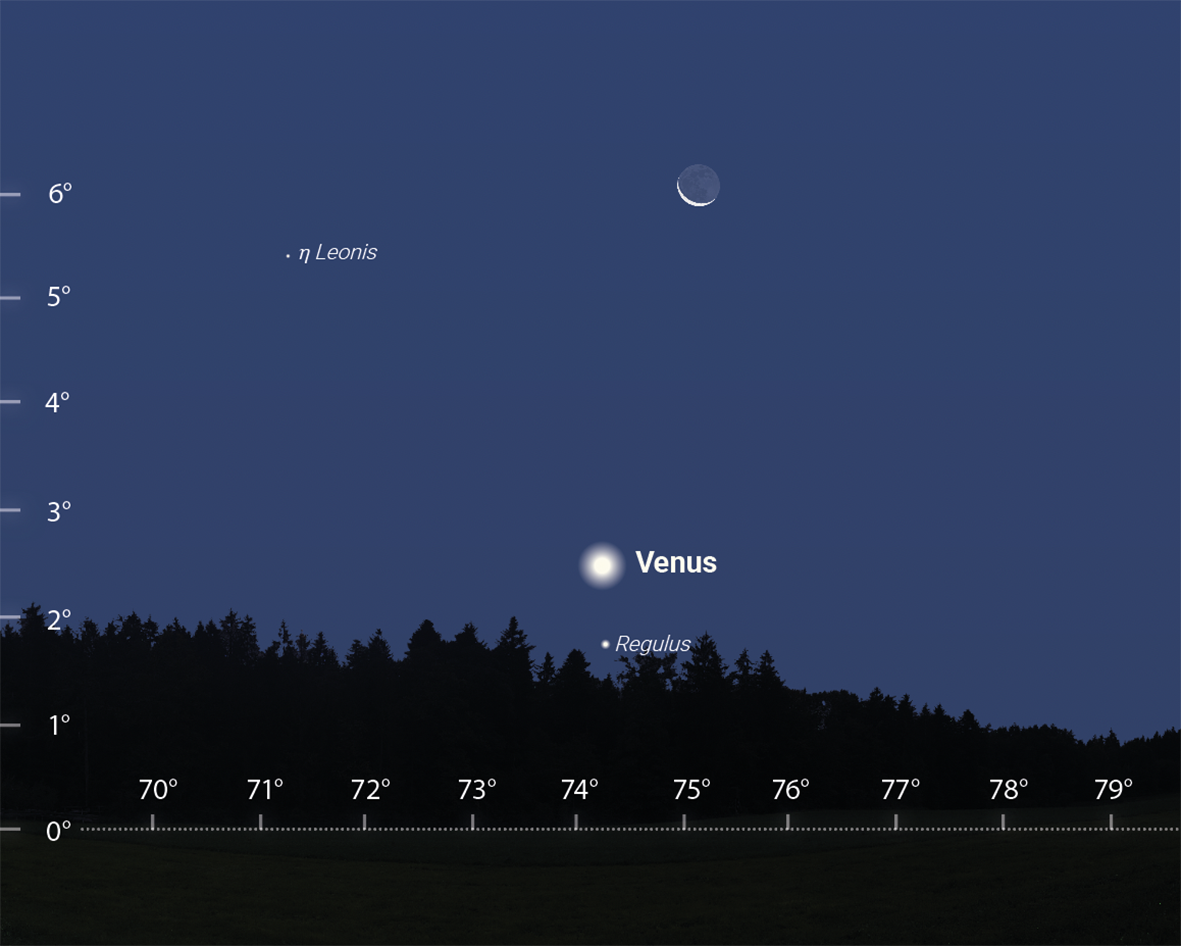 Heute Morgen gegen 05:00 Uhr MESZ können wir die abnehmende Mondsichel im Löwen nahe von Venus und Regulus sehen. In den Nachmittagsstunden ereignet sich eine Venusbedeckung am Taghimmel. Mars zieht sich vom Abendhimmel zurück. Venus ist als «Morgenstern» zu sichtbar und entfernt sich von Jupiter immer weiter. Merkur gelangte in obere Konjunktion mit der Sonne und ist daher unbeobachtbar. Uranus ist bis zum Dämmerungsbeginn teleskopisch am Morgenhimmel sichtbar. Saturn finden wir westlich von ihr nahe des Frühlingspunktes nahe von Neptun.