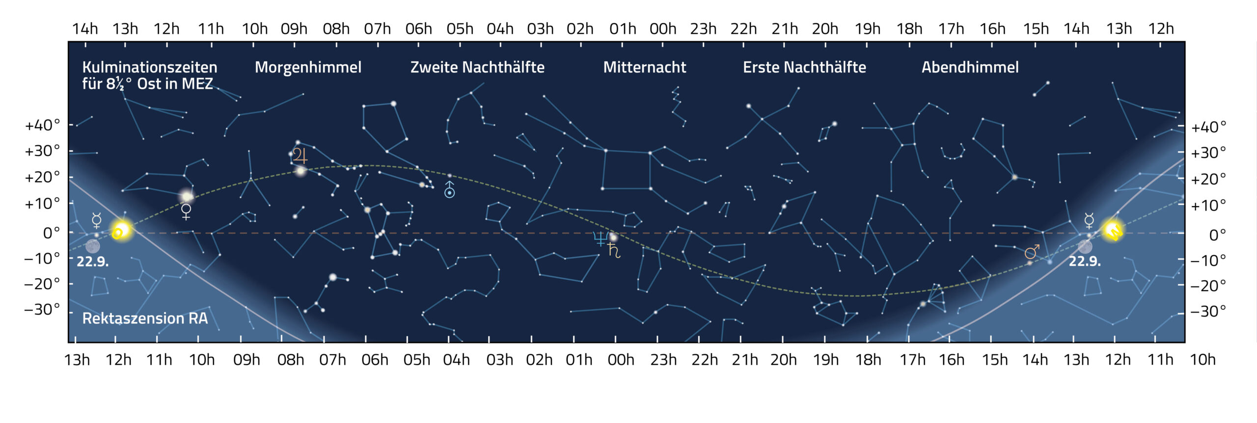 Die Sonne überquert den Himmelsäquator südwärts; wir haben den astronomischen Herbstanfang. Heute Abend gegen 20:30 Uhr MESZ können wir die sehr schmale zunehmende Mondsichel in der Jungfrau nicht sehen; sie geht praktisch mit der Sonne unter. Mars zieht sich vom Abendhimmel zurück. Venus ist als «Morgenstern» zu sichtbar und entfernt sich von Jupiter immer weiter. Merkur gelangte in obere Konjunktion mit der Sonne und ist daher unbeobachtbar. Uranus ist bis zum Dämmerungsbeginn teleskopisch am Morgenhimmel sichtbar. Saturn gelangte gestern in Opposition zur Sonne. Er steht nahe des Frühlingspunktes etwas südwestlich von Neptun.