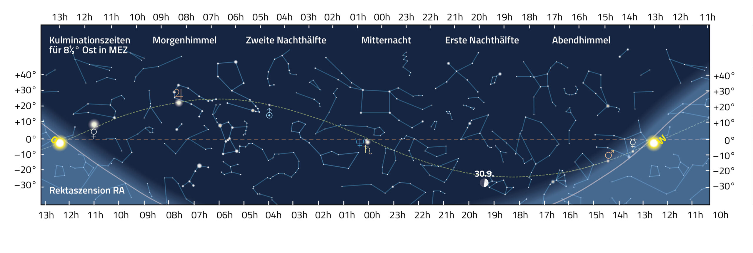 Heute Abend gegen 20:30 Uhr MESZ können wir den zunehmenden Halbmond im Schützen sehen. Das Erste Viertel wird frühmorgens erreicht. Mars zieht sich vom Abendhimmel zurück. Venus ist als «Morgenstern» zu sichtbar und entfernt sich von Jupiter immer weiter. Merkur löst sich östlich von der Sonne, bleibt aber weiterhin unbeobachtbar. Uranus ist bis zum Dämmerungsbeginn teleskopisch am Morgenhimmel sichtbar. Saturn gelangte in Opposition zur Sonne. Er steht nahe des Frühlingspunktes etwas südwestlich von Neptun. Er stand in Opposition zur Sonne.