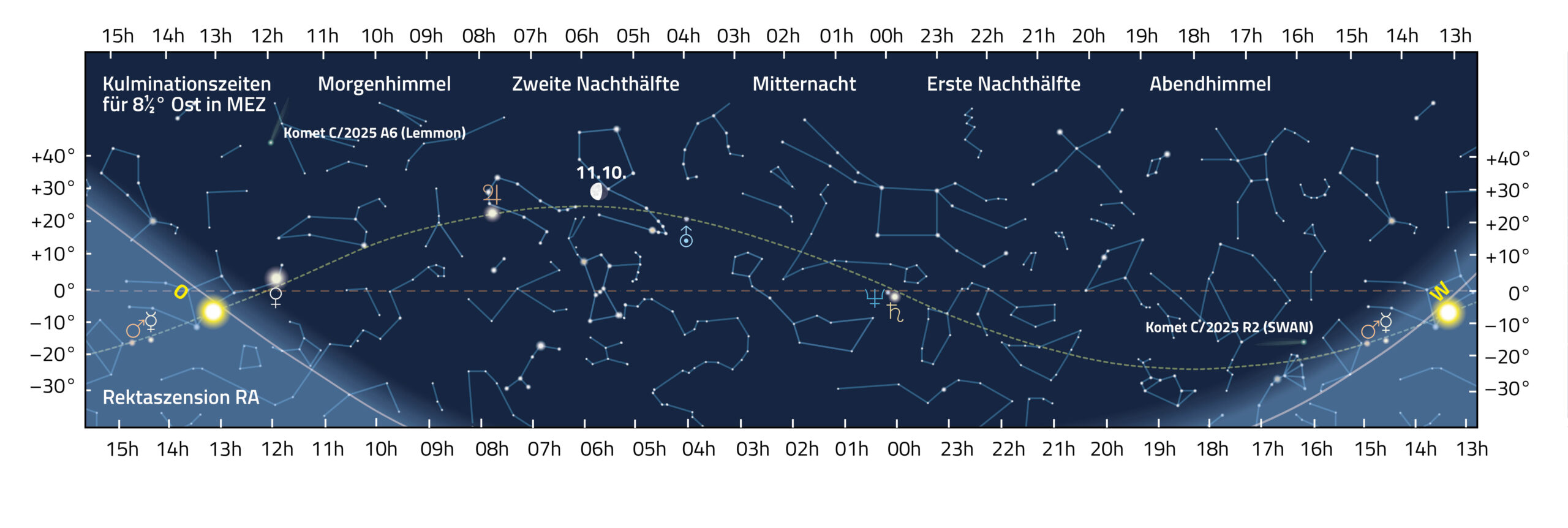Am Abendhimmel tauchen derzeit mit C/2025 R2 (SWAN) und C/2025 A6 (Lemmon) zwei Kometen auf, die sicher schöne Feldstecherobjekte abgeben, möglicherweise aber sogar knapp von blossem Auge gesehen werden könnten.