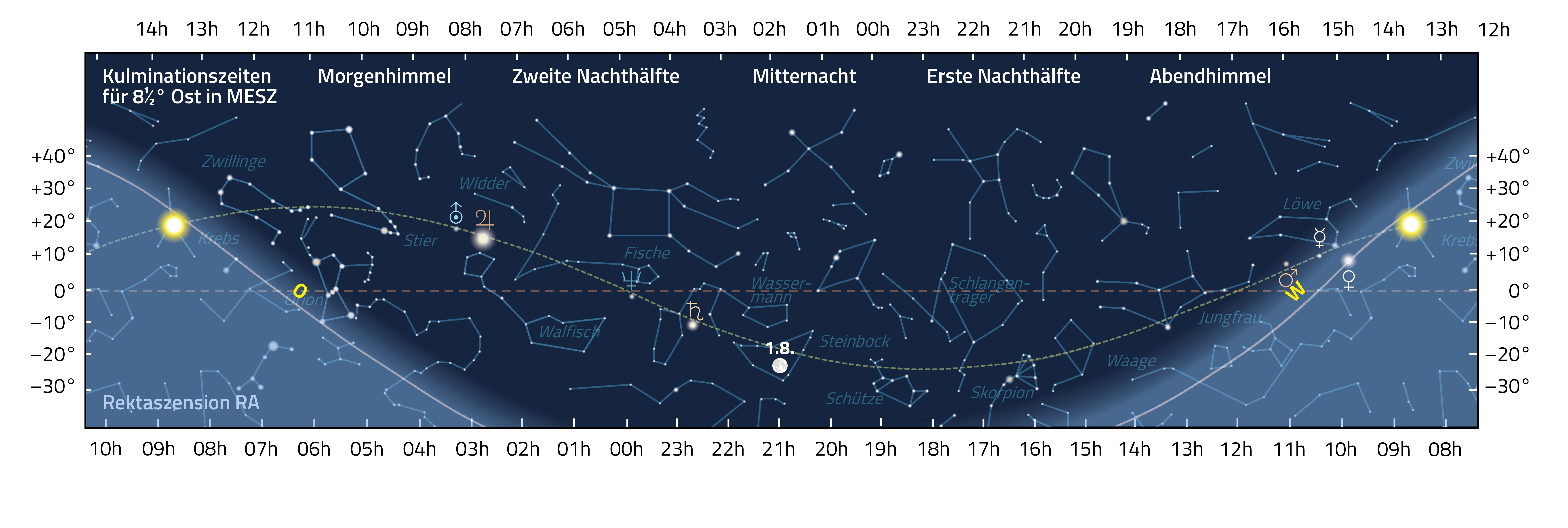 Hier sehen wir die Planeten längs der Ekliptik. Venus hat sich zurückgezogen, Mars und Merkur verabschieden sich ebenfalls. Saturn finden wir im Wassermann, Jupiter im Widder. (Grafik: Thomas Baer, Redaktion ORION)