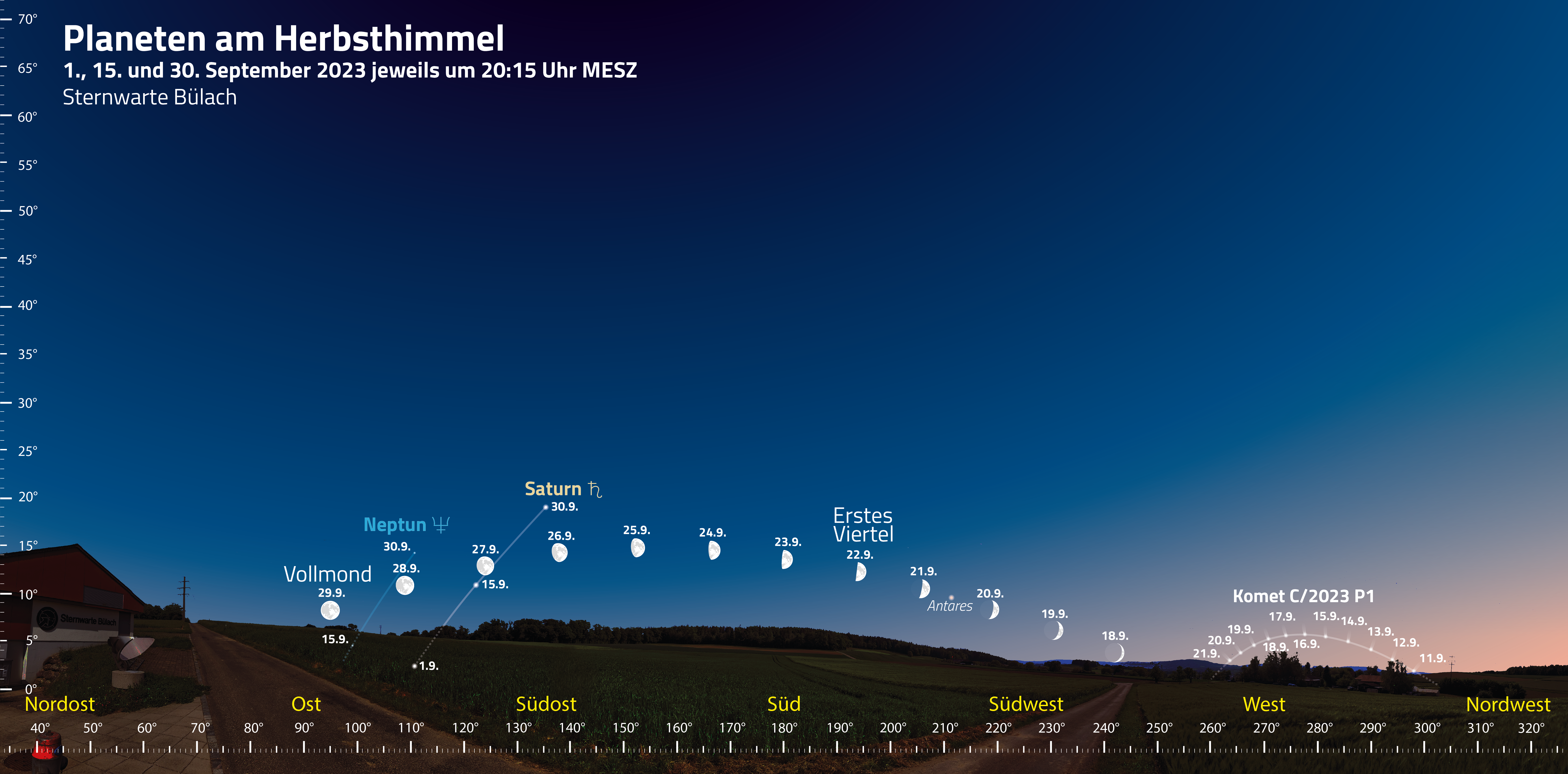 Gegen 05:00 Uhr MESZ können wir die abnehmende Mondsichel über Ost zu Süd im Sternbild des Stiers etwas östlich von Al Nath sehen. Jupiter wird gegen 22:00 Uhr MESZ im Osten sichtbar und kann bis zum Tagesanbruch verfolgt werden. Am Nachthimmel ist Saturn gut zu beobachten; er steht um 21:00 Uhr MESZ schon im Ostsüdosten auf und ist bis in die Morgendämmerung über den Südhorizont gewandert. Am 27. August 2023 stand er in Opposition zur Sonne. Uranus und Neptun sind jetzt beide ab dem Abend, wenn es dunkel genug ist, teleskopisch auffindbar.