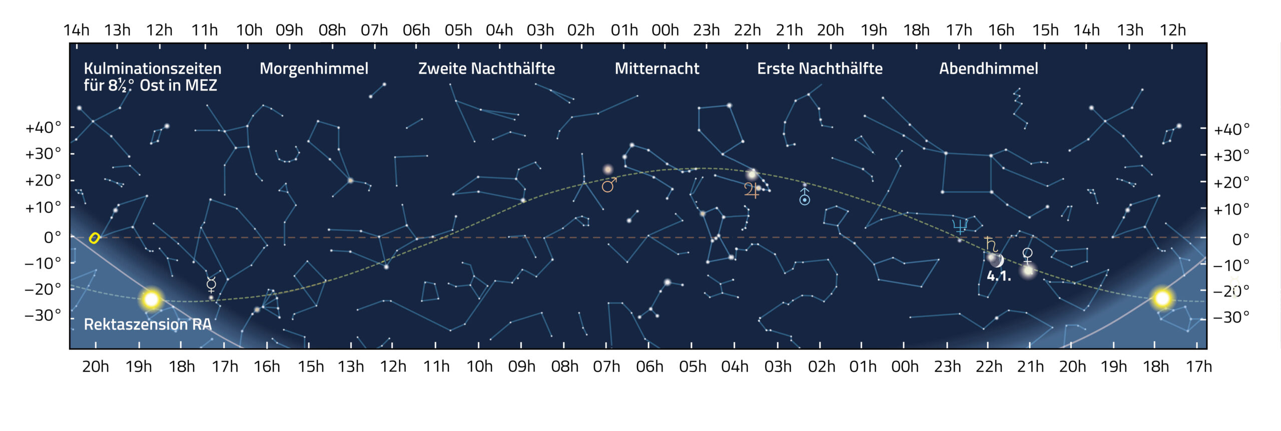 Heute Abend um 17:15 Uhr MEZ ist die zunehmende Mondsichel fast 34° hoch über Süd zu West zu sehen. Der Mond nähert sich dem Ringplaneten Saturn. Zwischen 18:31 und 19:35 Uhr MEZ kommt es zu einer Bedeckung des Planeten. Mars befindet sich zwischen Krebs und den Zwillingen. Er nähert sich seiner Oppositionsstellung und ist auffallend hell. Jupiter hält sich im Sternbild Stier knapp südlich des Sterns Tau Tauri auf. Zusammen mit Mars dominiert er die langen Januar-Nächte.