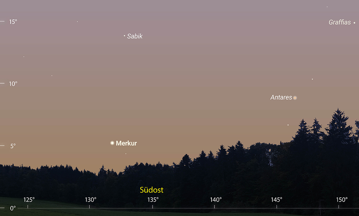 07:30.0Merkur (–0.35mag) 5° 00’ über dem Südosthorizont (Fernglas empfohlen)