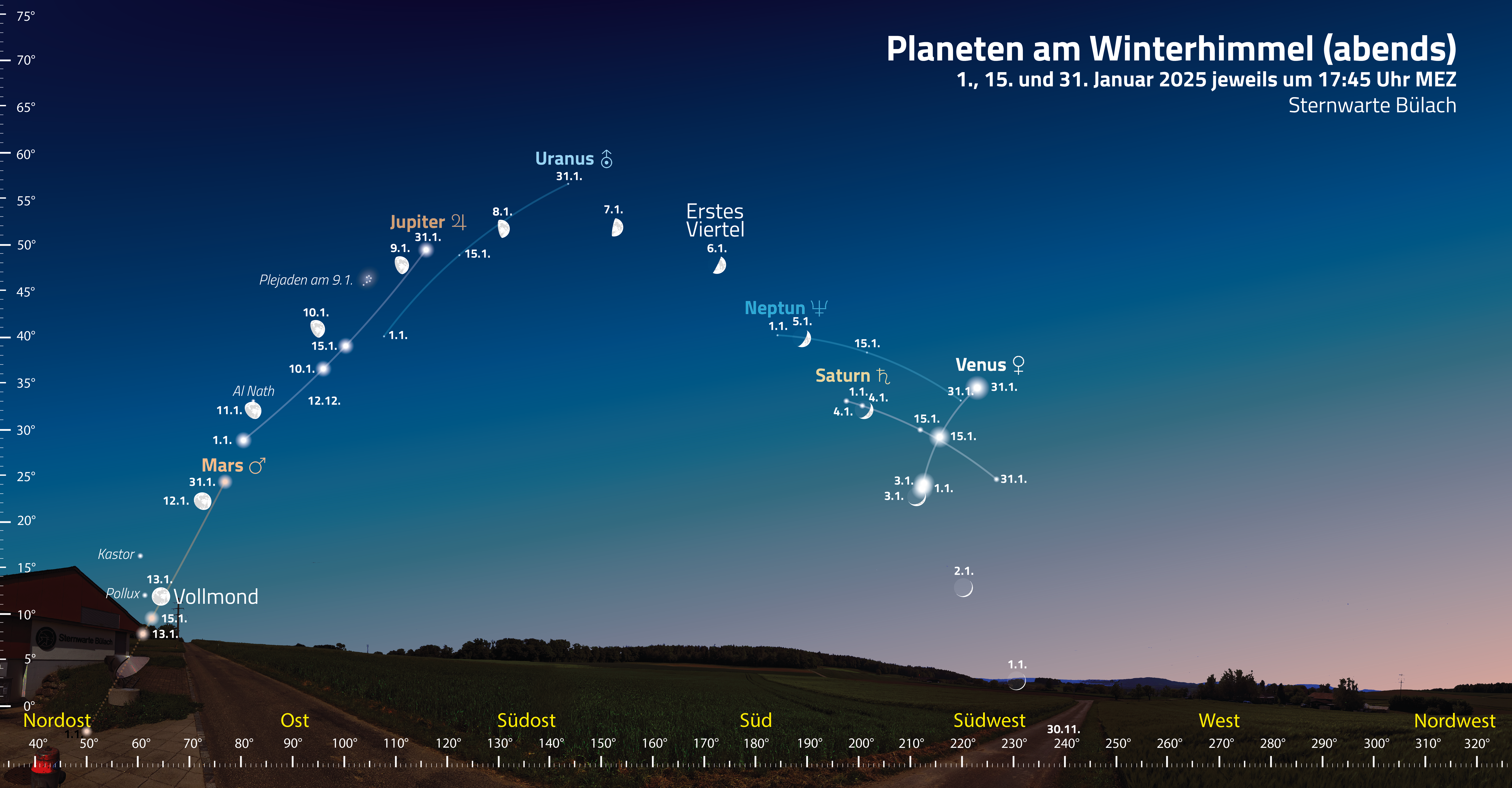 Aktuell können mit Ausnahme von Merkur alle hellen Planeten am Abend- und Nachthimmel beobachtet werden. Nach Jupiter geht auch noch Mars im Nordosten auf. Die Planetenpositionen sind für den 1., 15. und 31. Januar 2025 um 17:45 Uhr MEZ gezeichnet. (Grafik: Thomas Baer, Redaktion ORION)