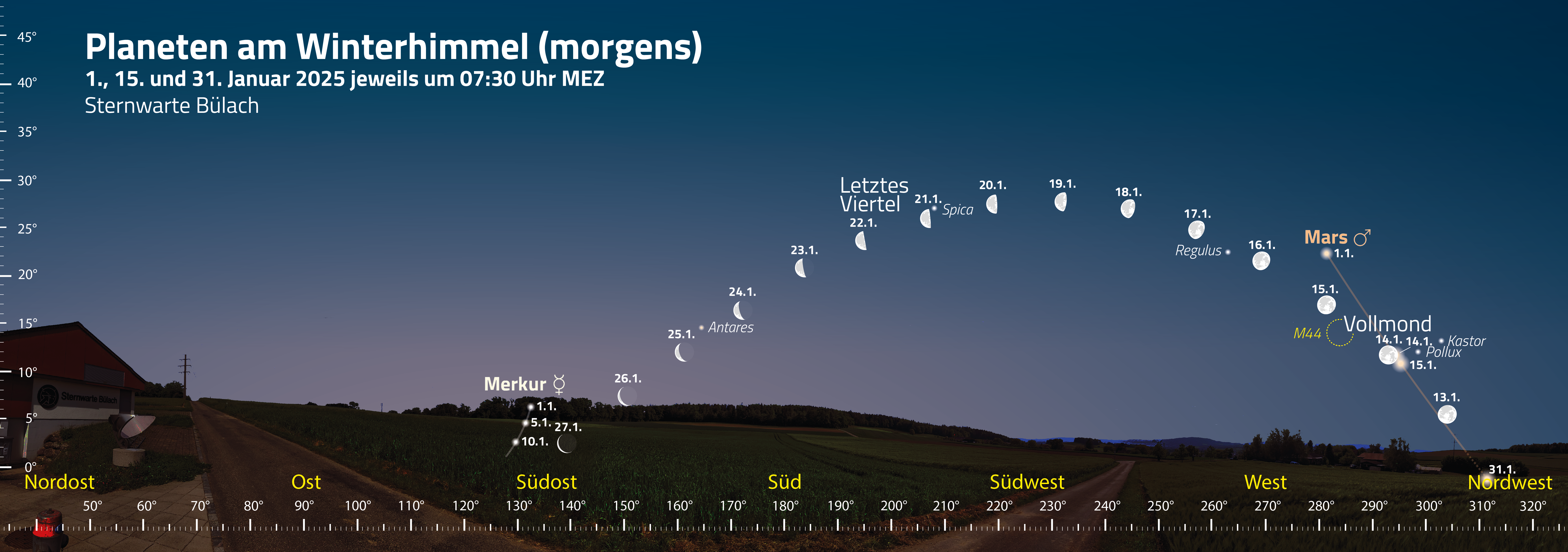 Merkur beendet in der ersten Januarwoche seine respektable Morgensichtbarkeit. Mars können wir morgens noch tief im Nordwesten erspähen.