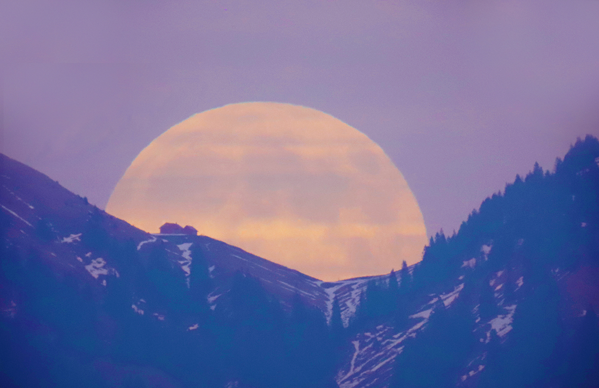 Der Mondaufgang war überaus spektakulär zu beobachten, denn in Horizontnähe wirkt der Trabant infolge einer optischen Täuschung noch viel grösser. Dies erkennen wir am Bild oben, wo sich die Silhouette der Alpe Obergelchenwang am Nordhang des Hochgrats in der Mondscheibe zeigt. Von meinem Standort aus sind es etwa 16 km Luftlinie.