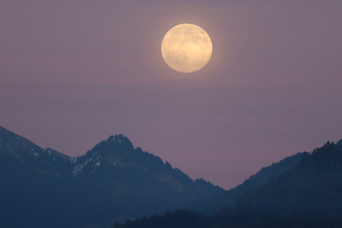 Heute Nacht erleben wir den erdnächsten Vollmond des Jahres im Sternbild Widder. Die exakte Vollmondphase trat bereits am frühen Nachmittag ein. Um 23:34 Uhr MEZ steht der Mond mit 356‘830 km in Erdnähe. Damit erscheint uns die Mondscheibe fast 14 % grösser als wenn sich der Vollmond in Erdferne befindet, und aufmerksame Beobachter werden die um knapp einen Drittel hellere Vollmondnacht durchaus realisieren.