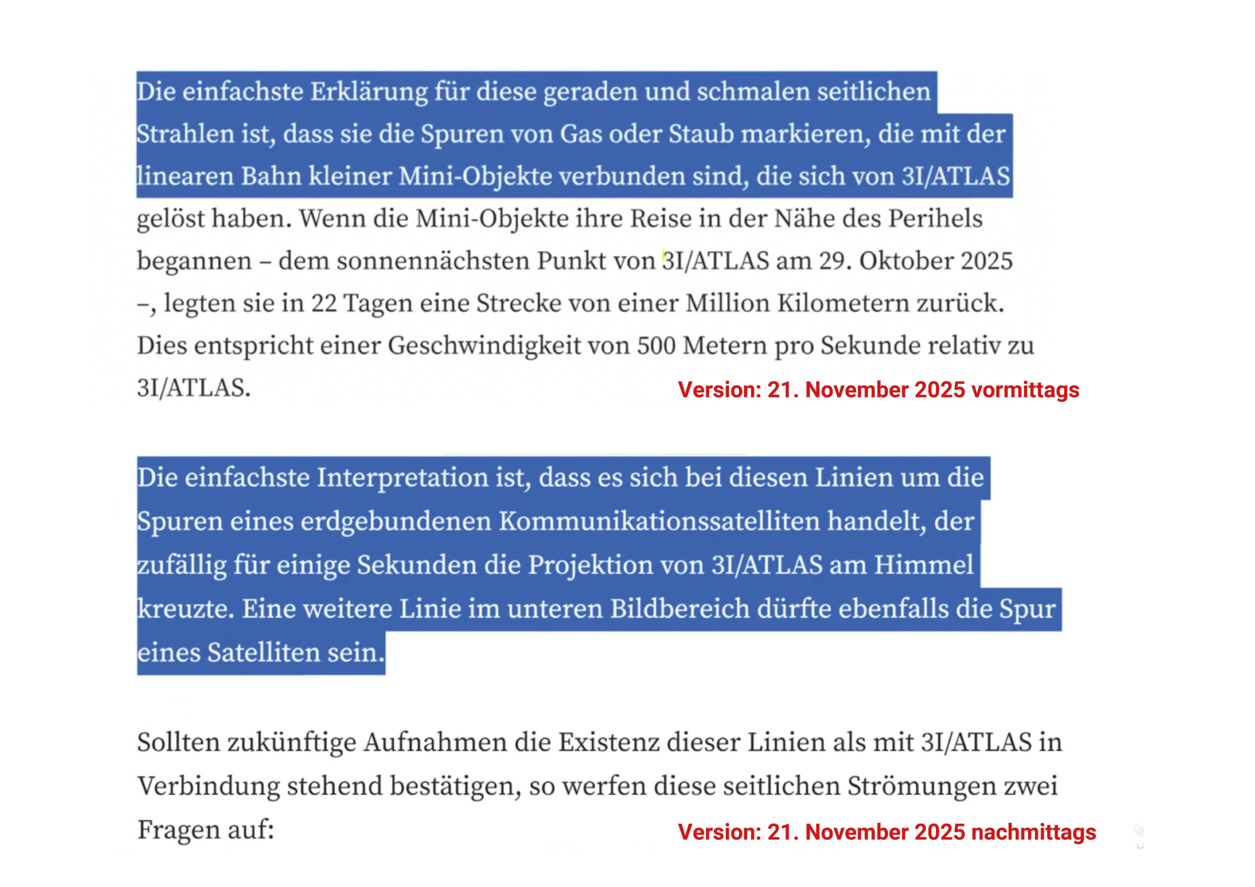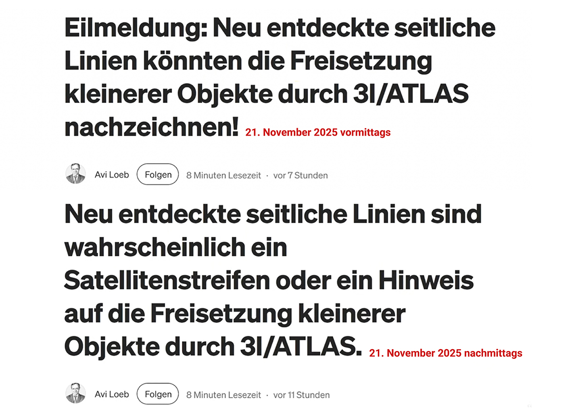 Kaum zwei Stunden später, kommt das, was zu erwarten war. Plötzlich heisst Loebs Blog-Titel nun: «Neu entdeckte seitliche Linien sind wahrscheinlich Satellitenstreifen oder ein Hinweis auf die Freisetzung kleinerer Objekte durch 3I/ATLAS»! Er ändert im nachfolgenden Lauftext einige Passagen ab, doch die weltfremde Interpretation der «Jets», die er auf dem einen Bild sehen wollte, lässt er weiter stehen. Es ist mehr als fraglich, wie ein vermeintlich ‘renommierter Wissenschaftler’ seine eigens aufgestellten Theorien nicht einmal prüft, denn, sollten diese ominösen Jets tatsächlich von 3I/ATLAS ausgehen, müssten diese logischerweise auf allen Bildern, die in den Tagen davor und danach vom Objekt geschossen wurden, ebenfalls zu sehen sein! Ausserdem sind auf vielen anderen Bildern, die man im Internet findet, diverse Satellitenspuren zu sehen, die den Kometen teilweise auch kreuzen.