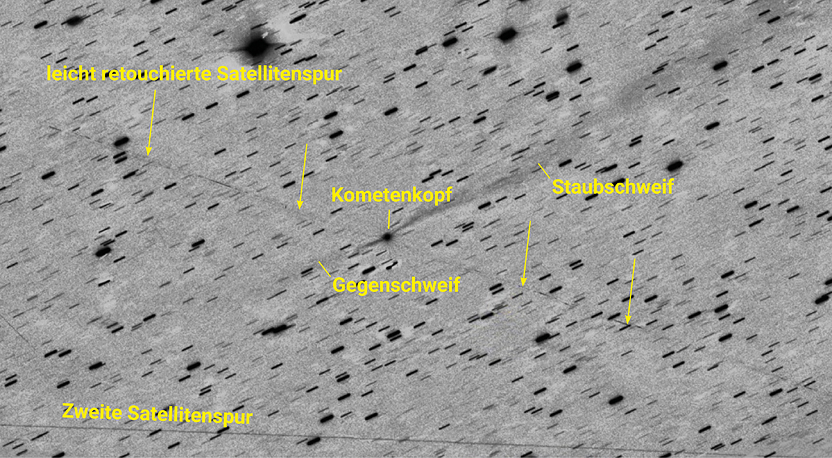 Die eindeutige Satellitenspur, die zufällig den Kometen kreuzt, interpretierte Loeb als «Jets», die vom Kometen ausgehen sollen. Weder auf früheren Bildern, noch auf späteren Aufnahmen sind diese zu sehen. (Quelle: LPIndie – Astronomie und Wissenschaft)