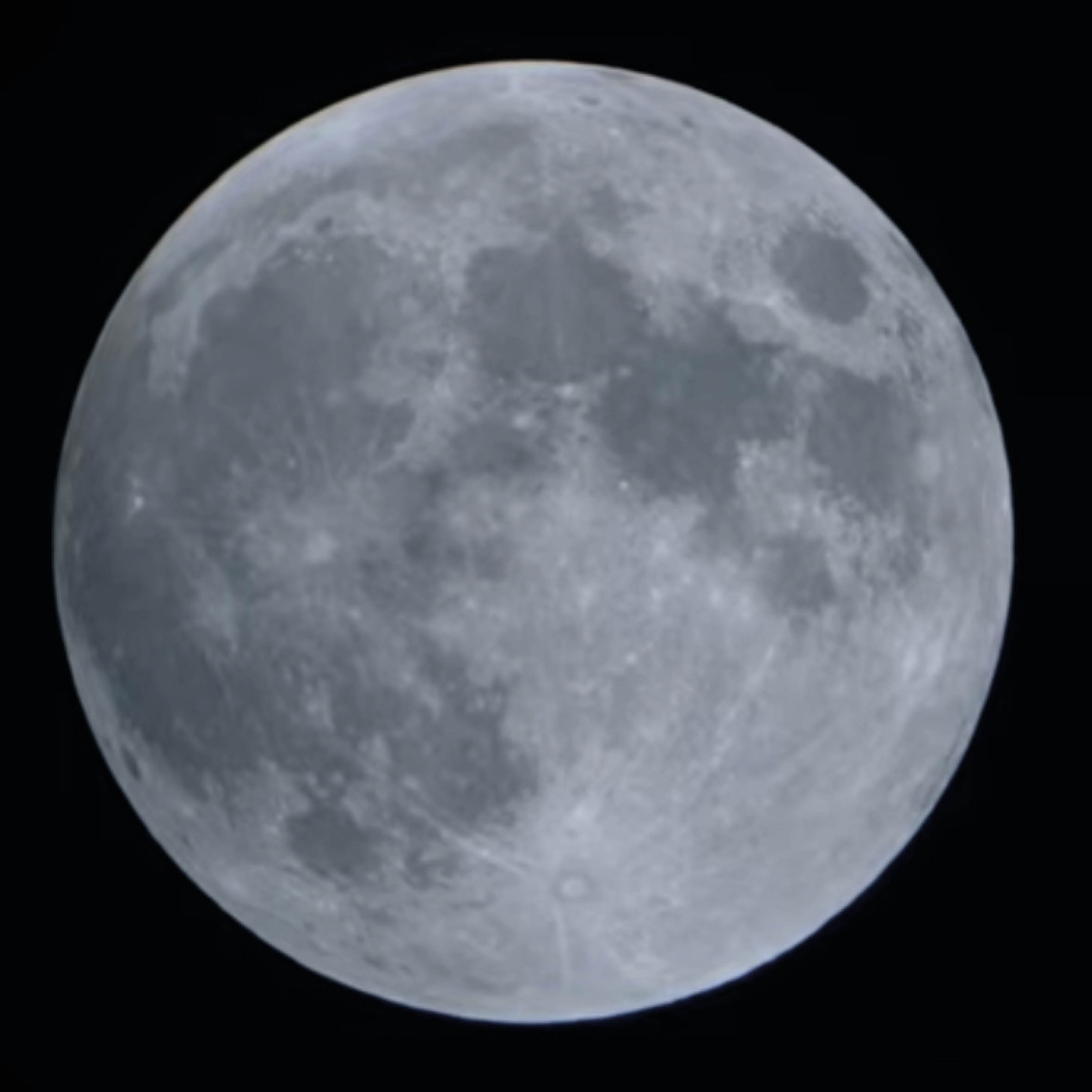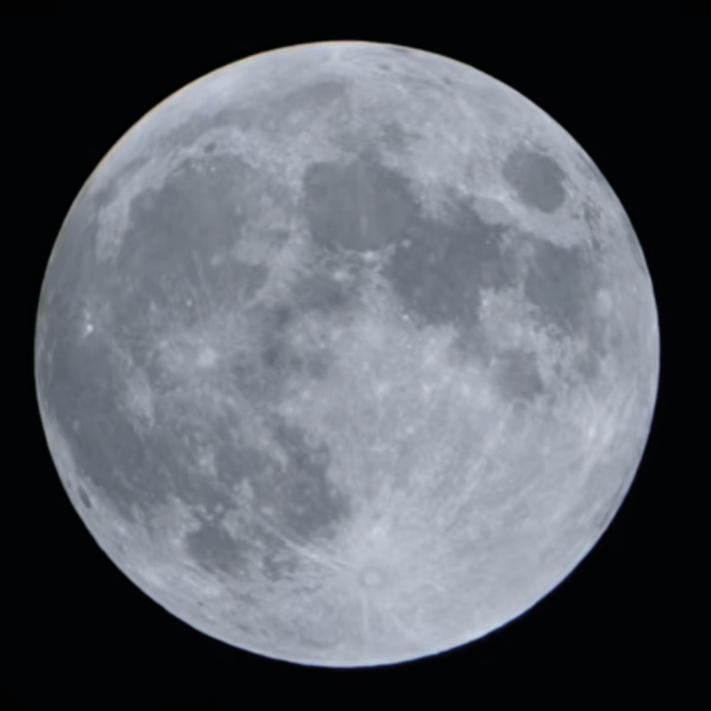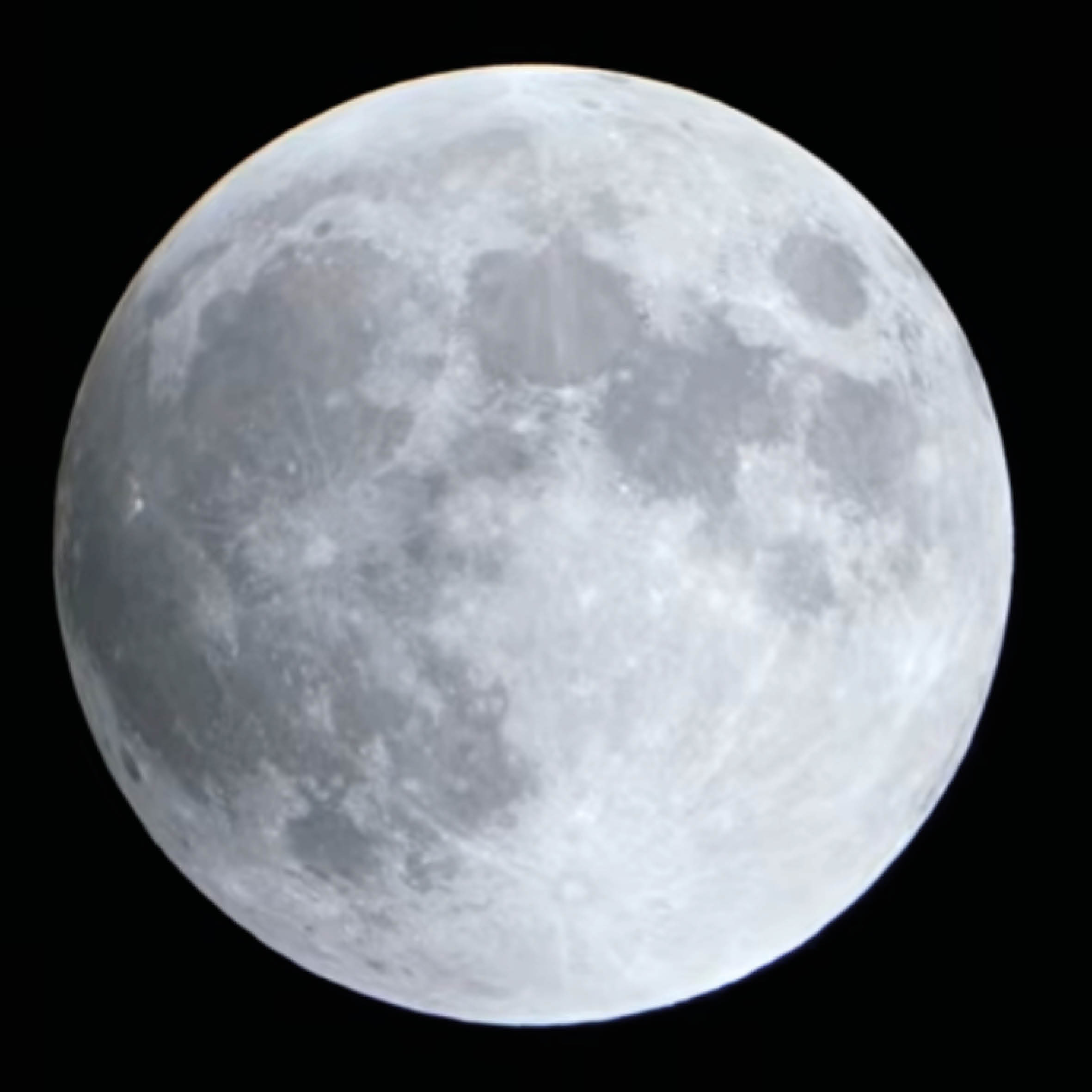 Immer weniger ist vom Vollmond im direkten Sonnenlicht zu sehen. Bald wird man auch die kupferrote Färbung im finsteren Teil sehen. Man achte, wie weit heute das Mare Crisium (ovales Mare oben rechts) vom Mondrand entfernt steht. Wir haben heute Abend die maximale Libration in Länge.
