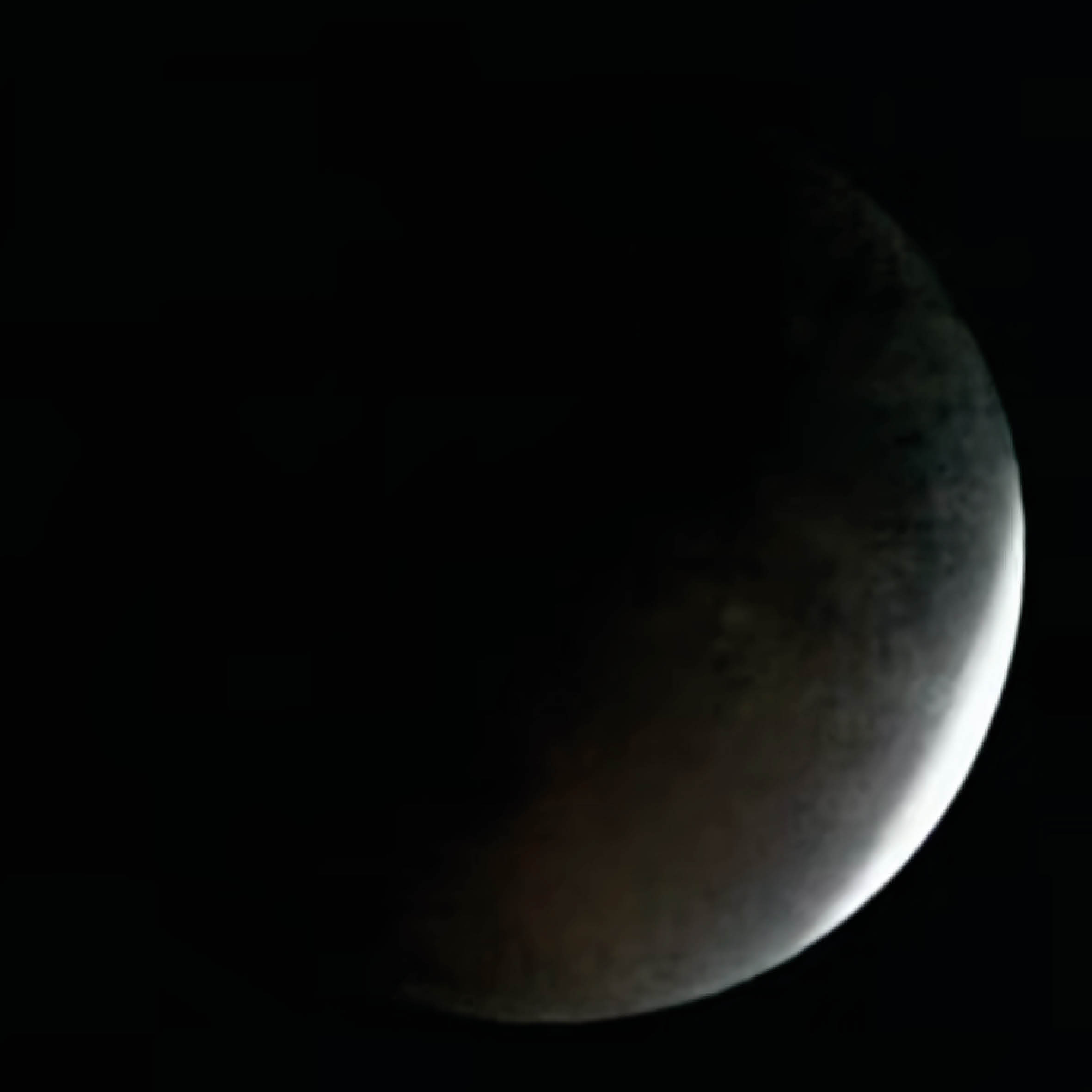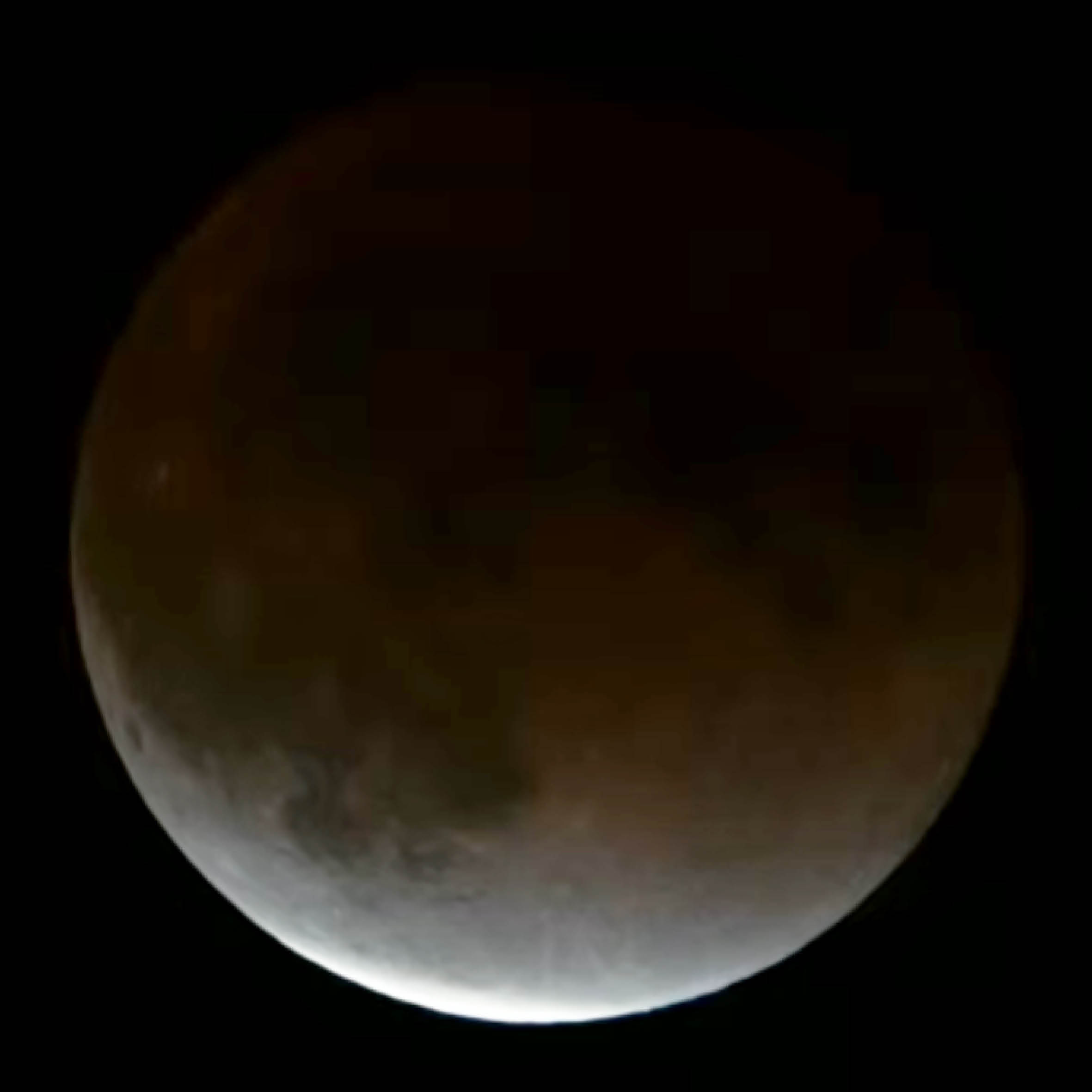 Die Wolken haben sich etwas verzogen und geben den Blick auf den total verfinsterten Mond frei. Bei randnahen Mondfinsternis kann oft das «weisse Kappen-Phänomen», eine starke Aufhellung zum Kernschattenrand hin beobachtet werden. Dieses stammt von Sonnenstrahlen, die durch die höhere Erdatmosphäre gelangen.