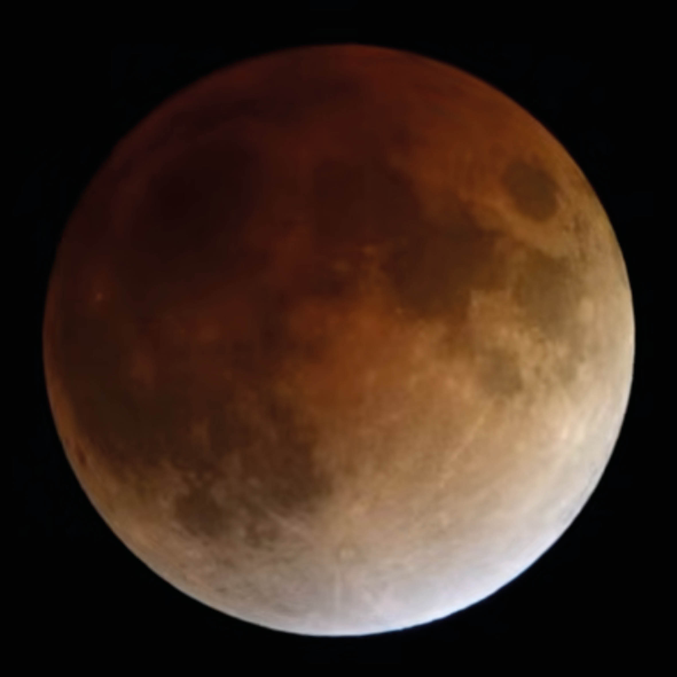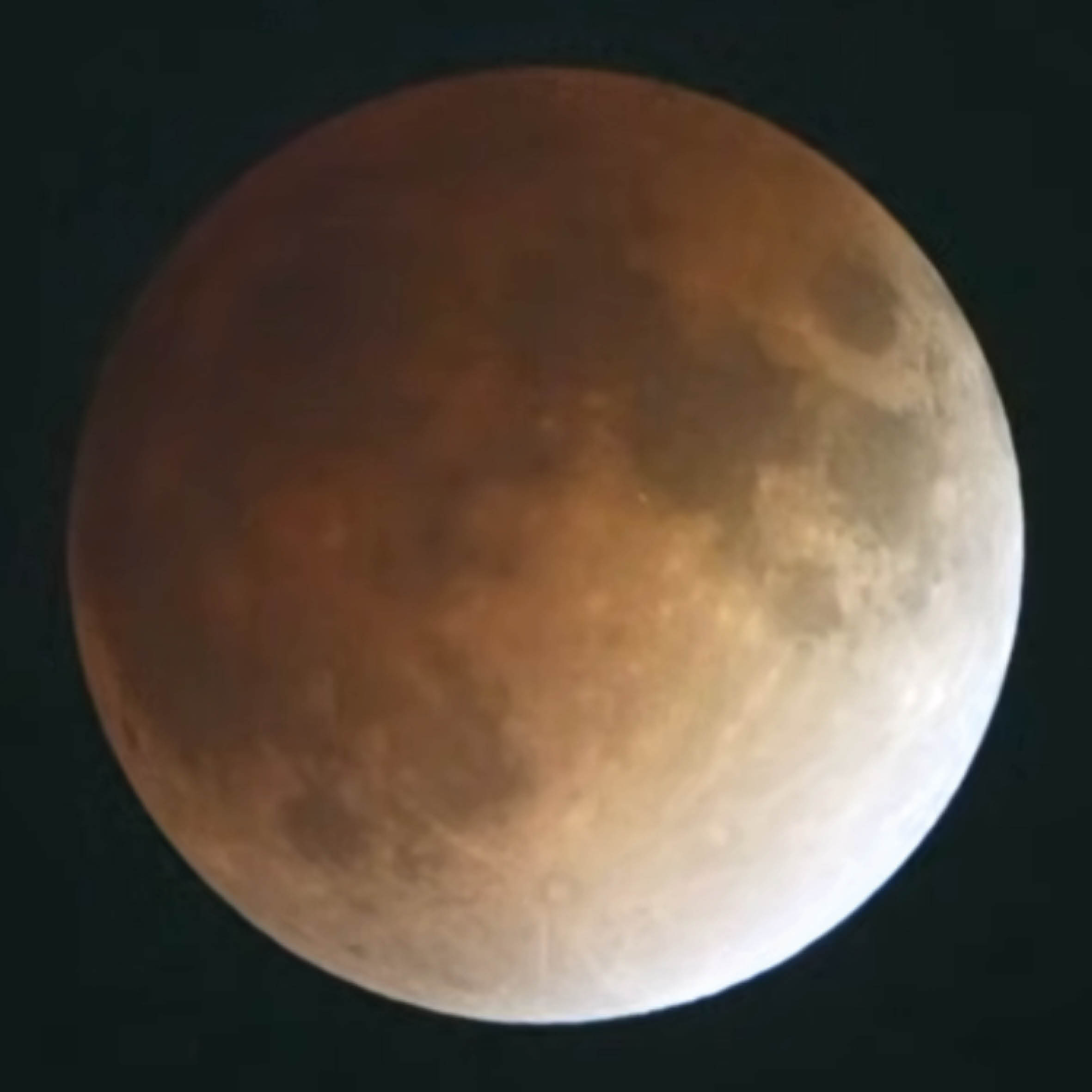 Die Finsternis erreicht ihr Maximum. Jetzt steht der Vollmond am tiefsten im Kernschatten und nähert sich fortan dem gegenüberliegenden Kernschattenrand. Das Restlicht stammt aus allen Zonen der Morgen- und Abenddämmerung.