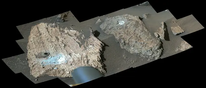 In der Region «Bright Angel» im Jezero Krater findet sich diese Formation, genannt Cheyava Falls, von der Perserverance im vergangenen Jahr eine Gesteinsprobe entnommen hat. Das entsprechende Bohrloch ist links zu sehen. Jüngste Untersuchungen der Probe bieten Hinweise auf einstiges Leben. (Quelle: NASA/JPL-Caltech/ASU/MSSS)