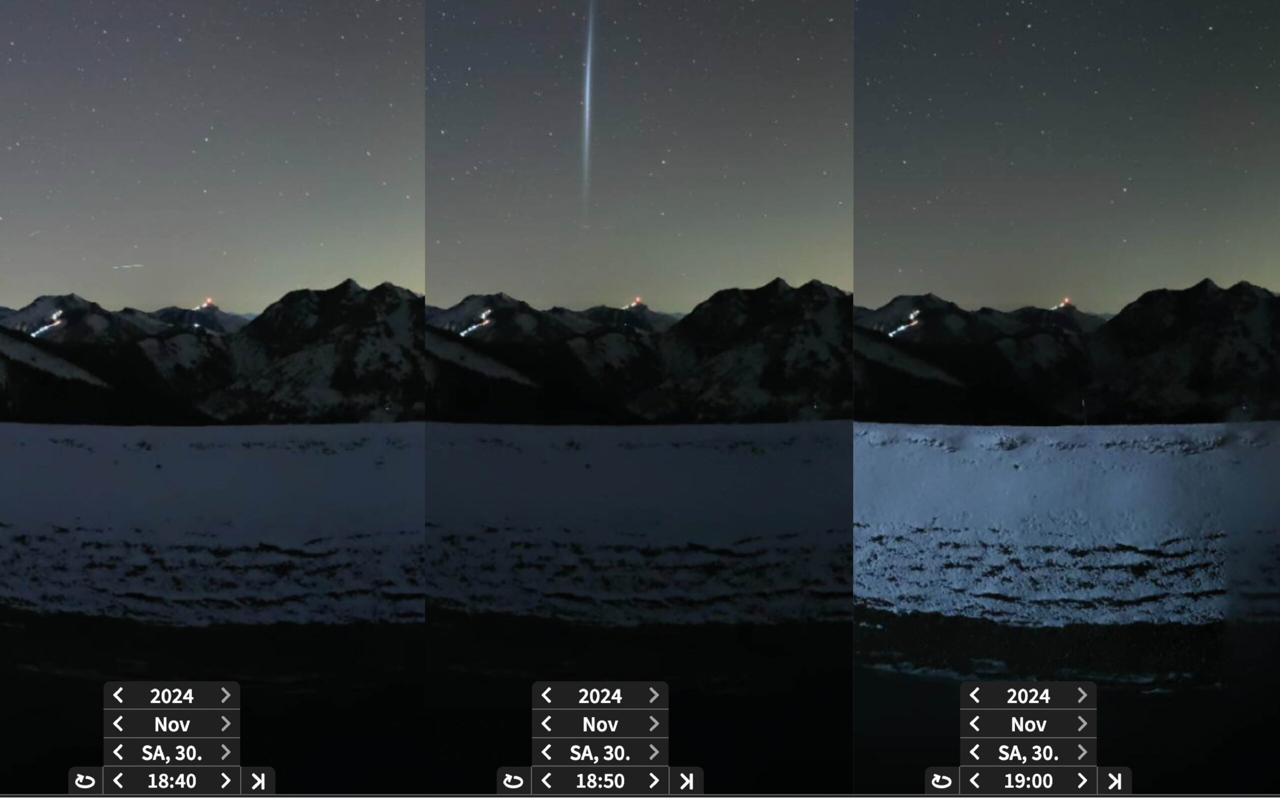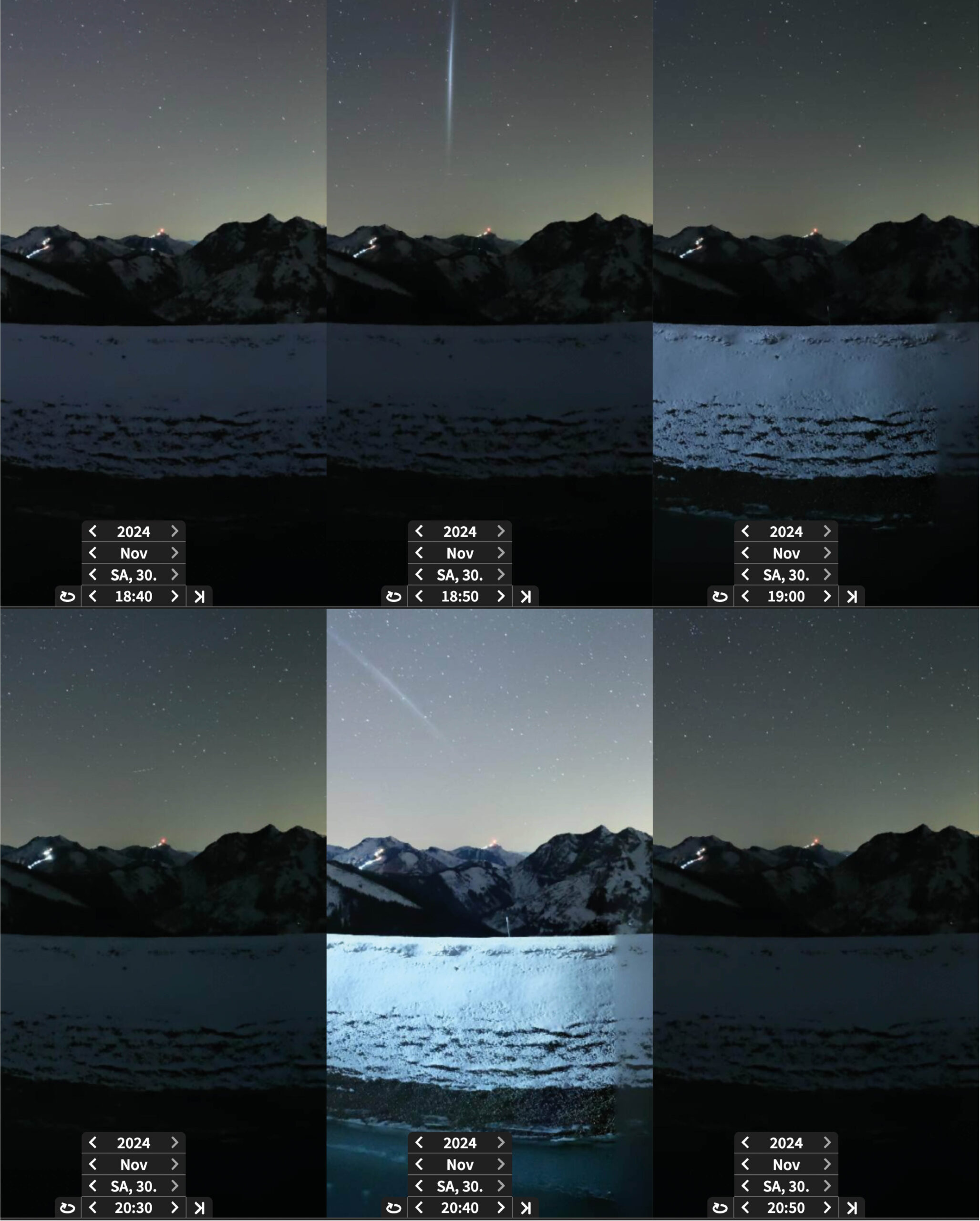 Und auch gestern (30. November) korrelierten die Zeiten der Leuchterscheinungen nicht mit den ISS-Überflügen, womit die ISS als mögliche Ursache ausgeschlossen werden kann. Überdies haben Augenzeugen berichtet, dass die Erscheinung nur etwa während 5 bis 10 min gesehen werden konnte. Auf den Webcambildern von Saalbach (Österreich) ist 18:40 Uhr MEZ nichts zu sehen, um 18:50 Uhr MEZ sieht man die Leuchtspur ganz deutlich, um 19:00 Uhr MEZ ist sie wieder verschwunden.