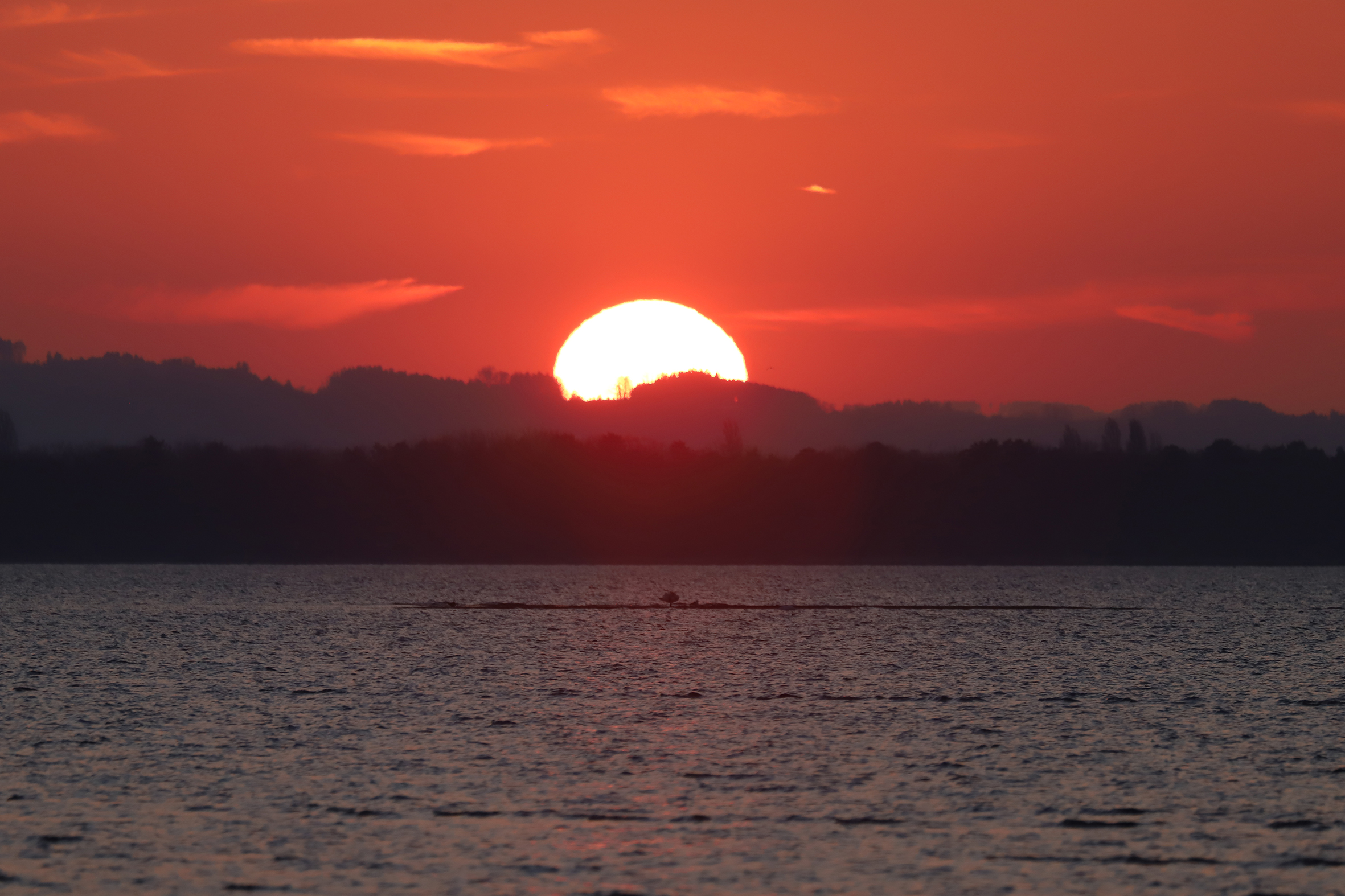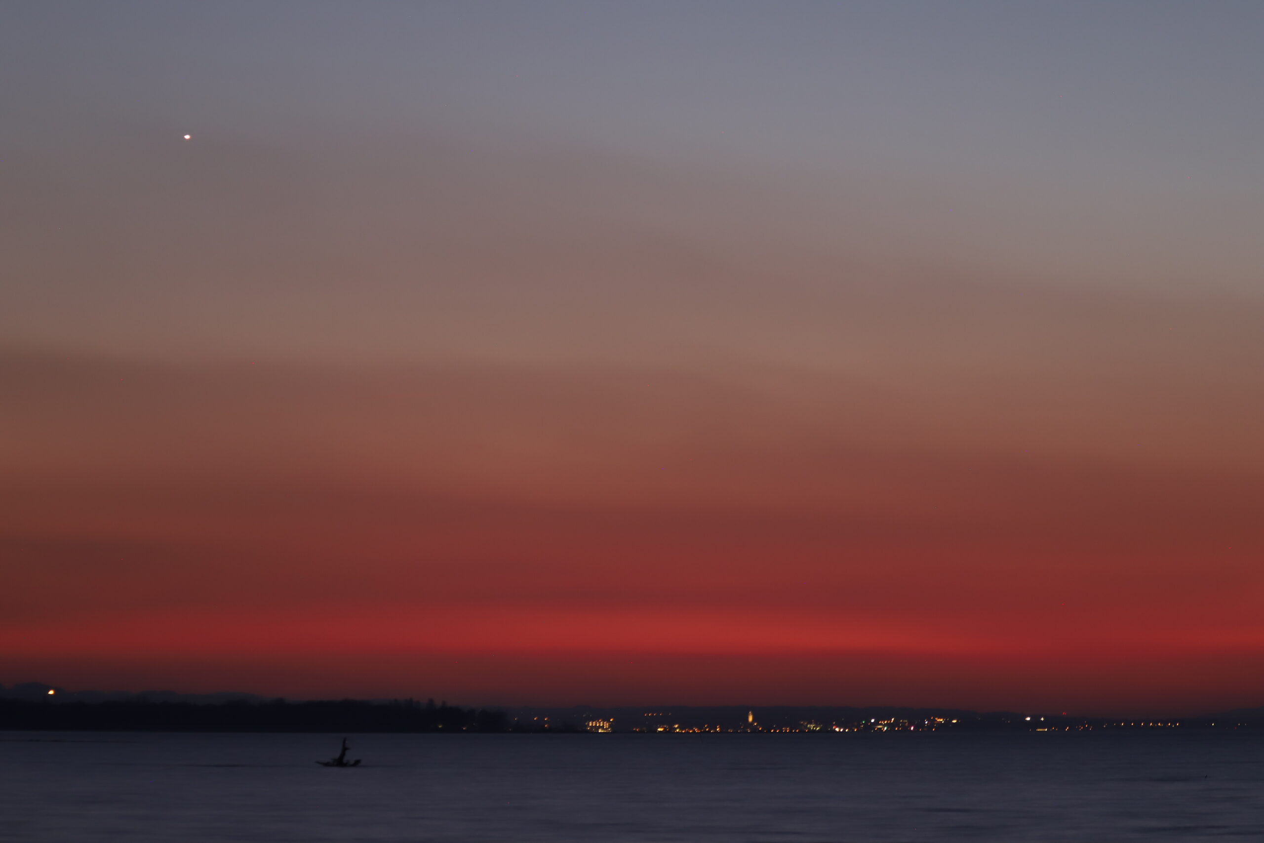Ich entschloss ans Rheindelta am Bodensee zu fahren, denn vom Rohrspitz aus hat man mit Blick in Richtung Romanshorn fast den mathematischen Horizont. Den Sonnenuntergang im spiegelnden See konnte man einen Tag vor dem Frühlingsanfang genau im Westen noch perfekt sehen, doch die Dunstschichten in Horizontnähe liessen die Hoffnung auf die nur 0.7 % beleuchtete Mondsichel rasch schwinden.